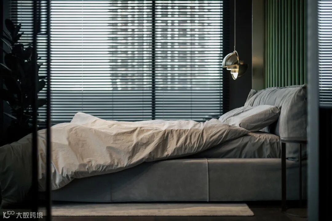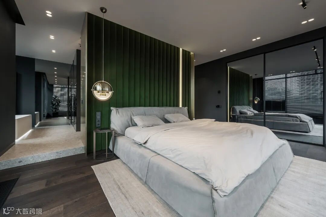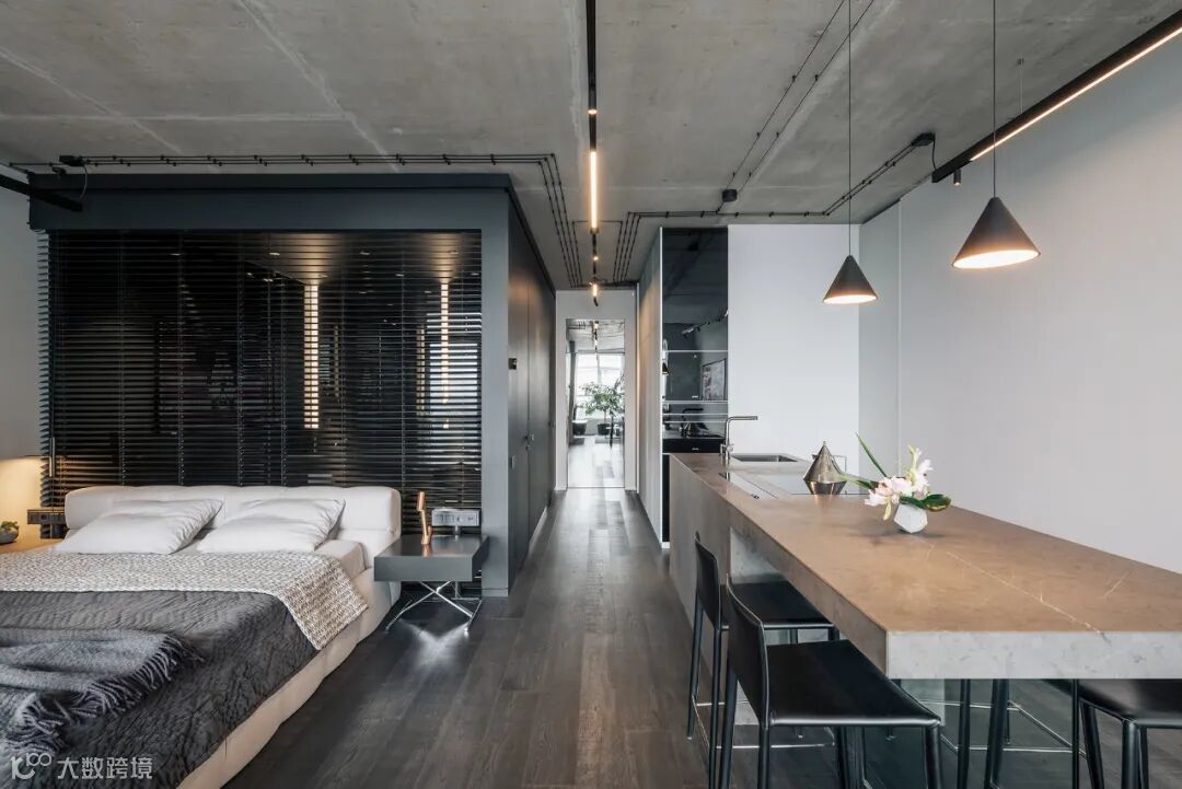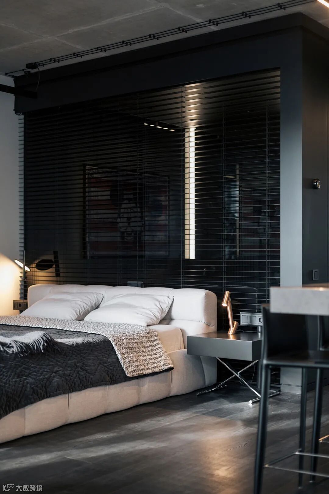 卧室与厨房毗邻,在岛台处几乎可以看到卧室的全局。卧室的背景墙使用了石墨玻璃和百叶窗的结合,低调而奢华,一片黑色中更加突出了白色床垫的柔软与温和。