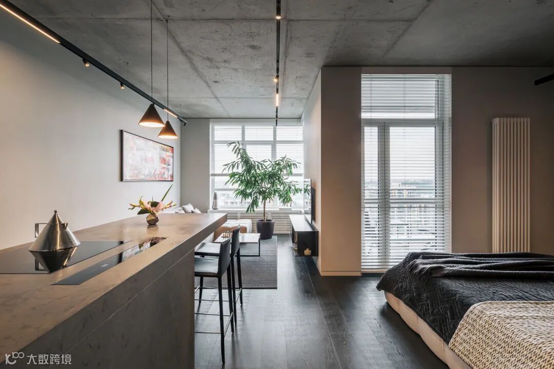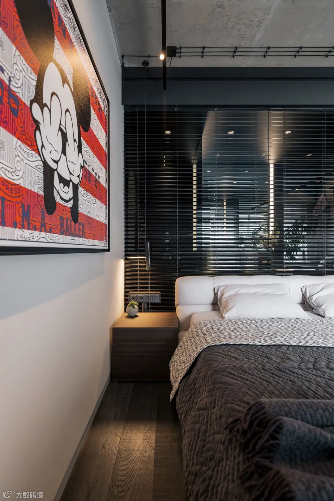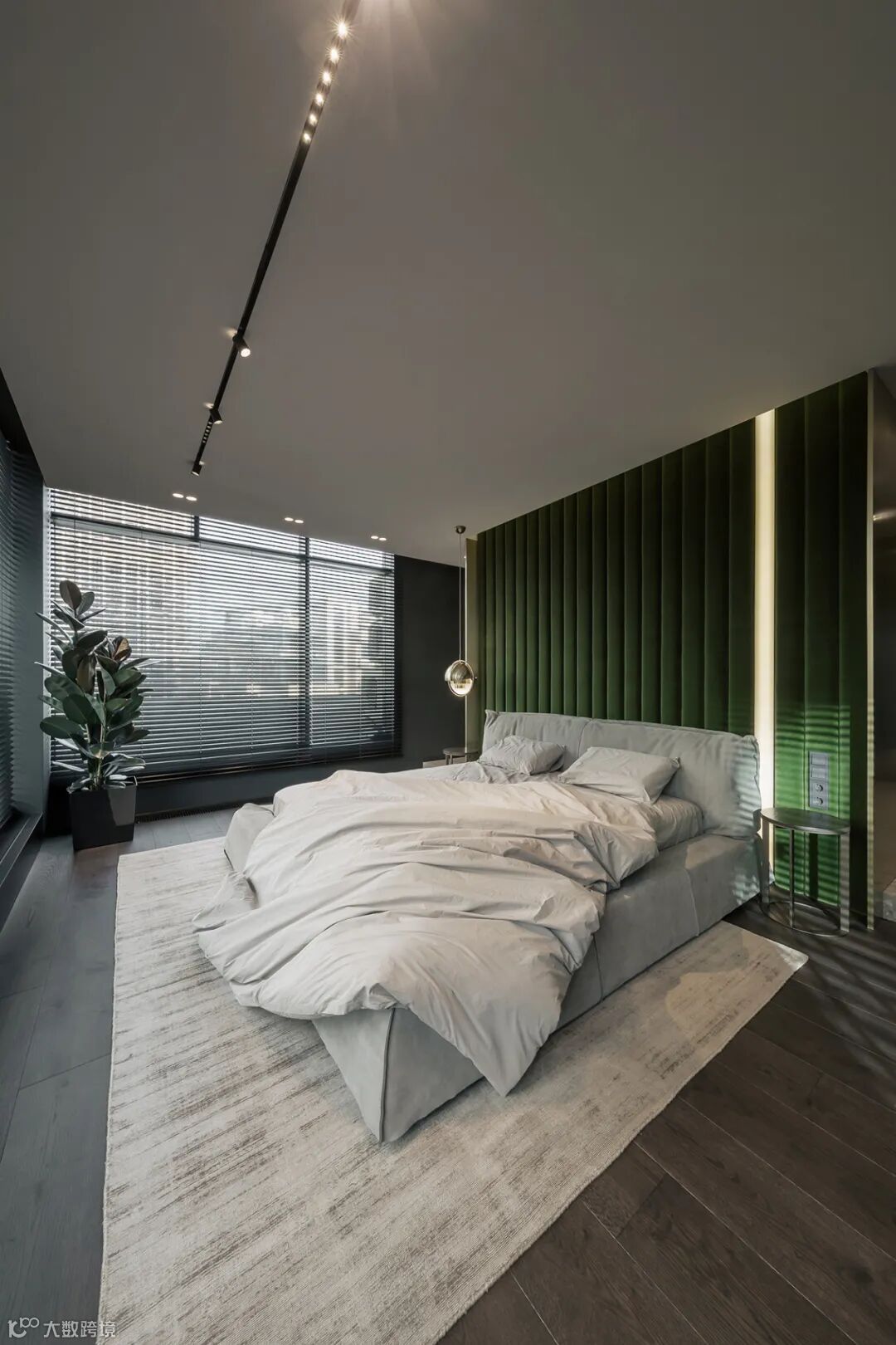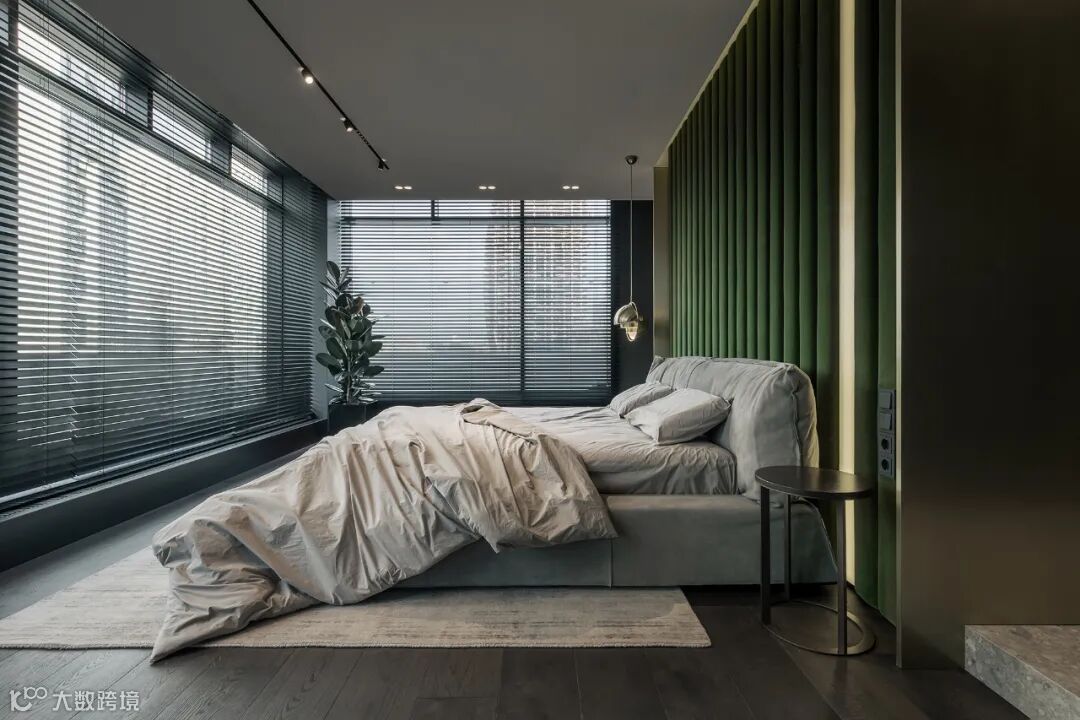 卧室与厨房毗邻,在岛台处几乎可以看到卧室的全局。卧室的背景墙使用了石墨玻璃和百叶窗的结合,低调而奢华,一片黑色中更加突出了白色床垫的柔软与温和。