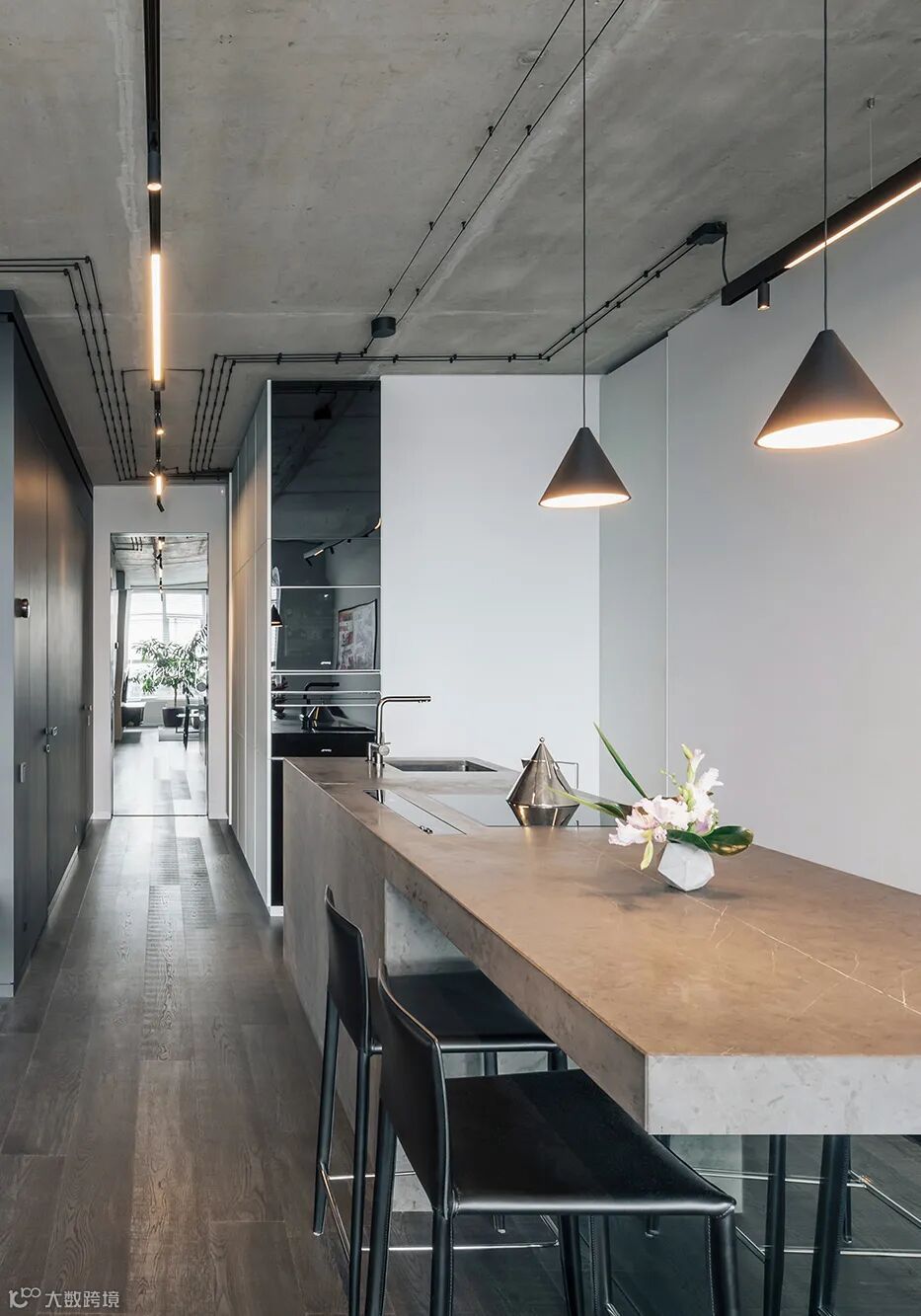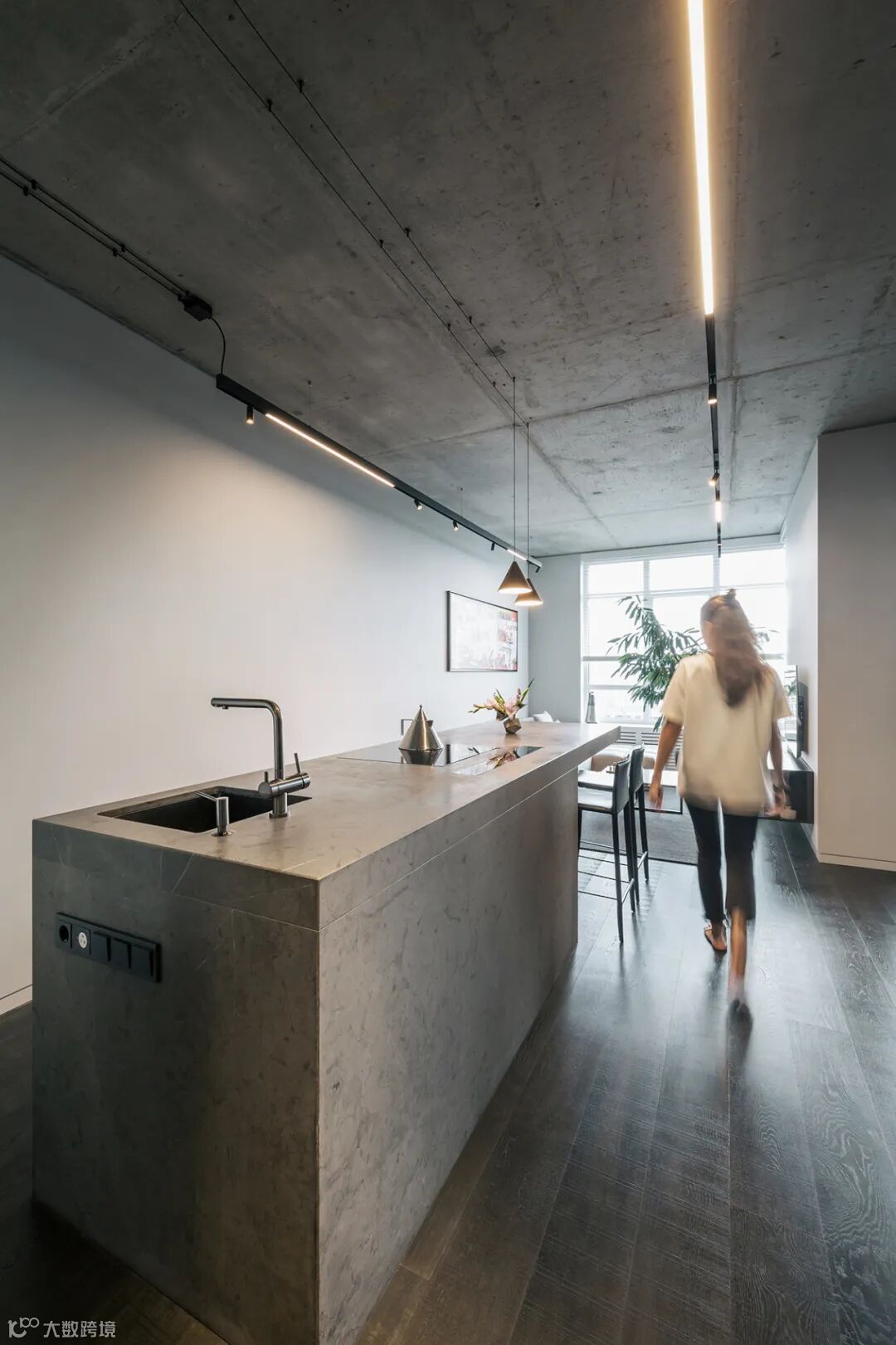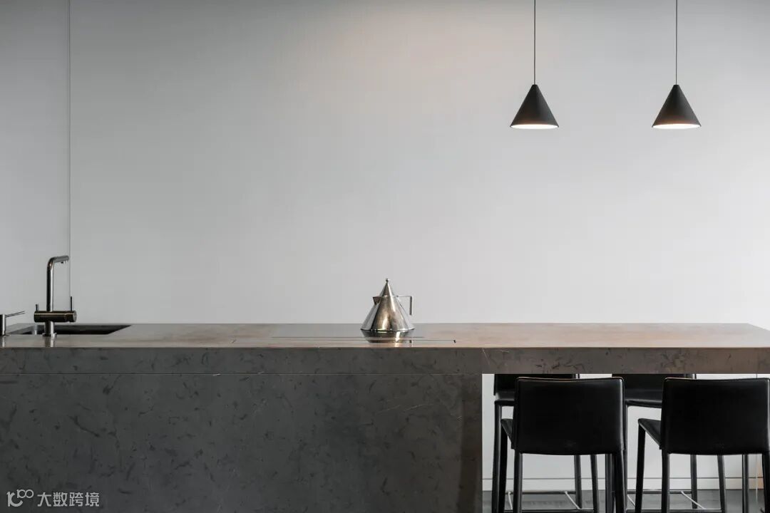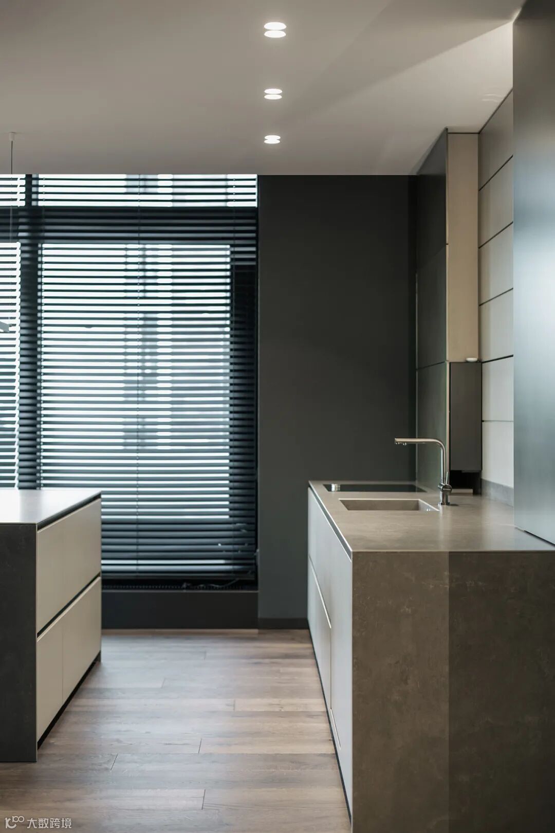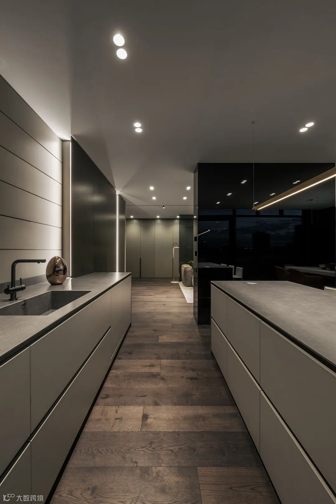 起居室与卧室由石墨玻璃隔开,精致的结构造型隐藏一个极具品质的烹饪世界。灰色的格调由银色五金点缀,境界朦胧,是极简表现奢华的典范。