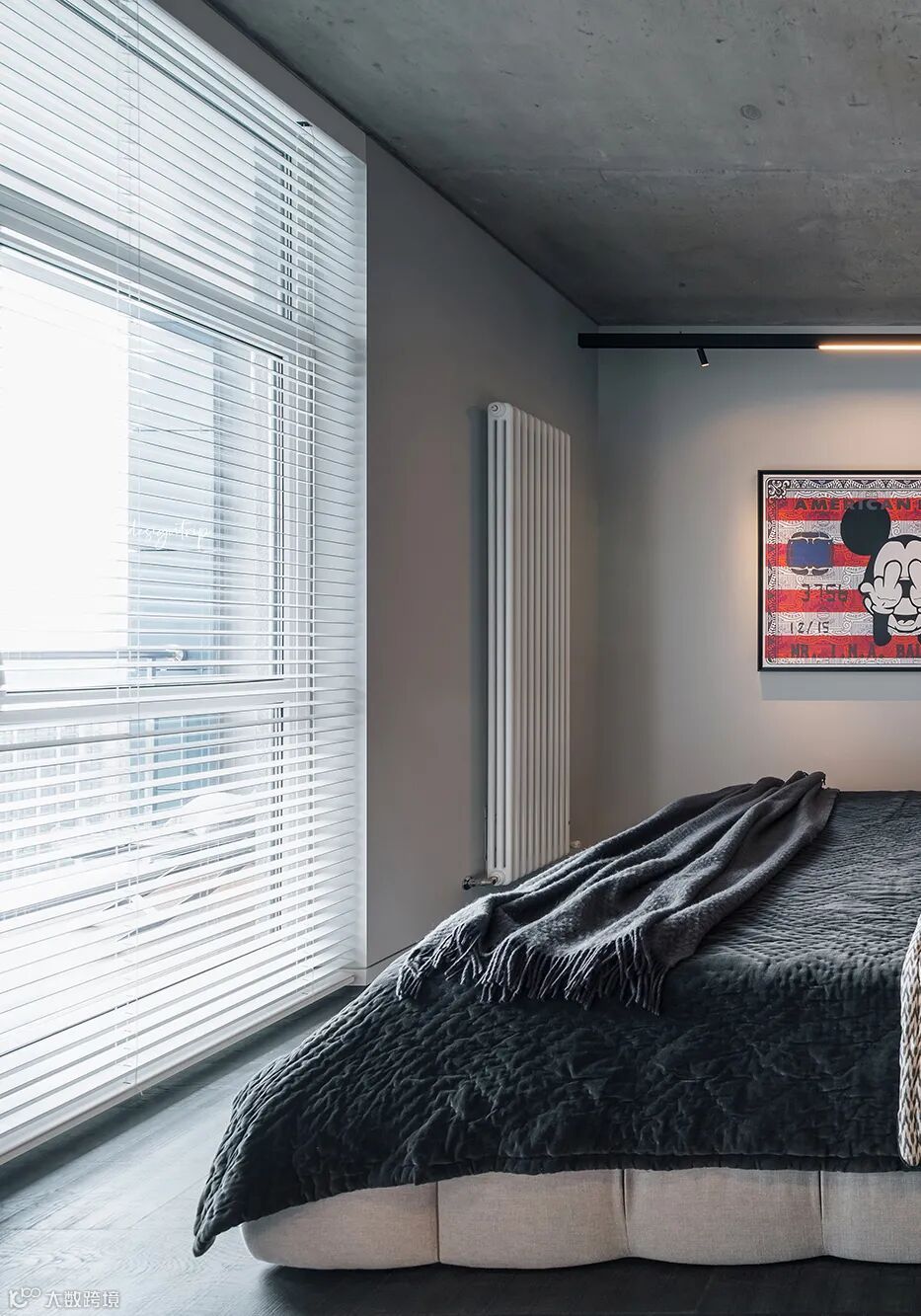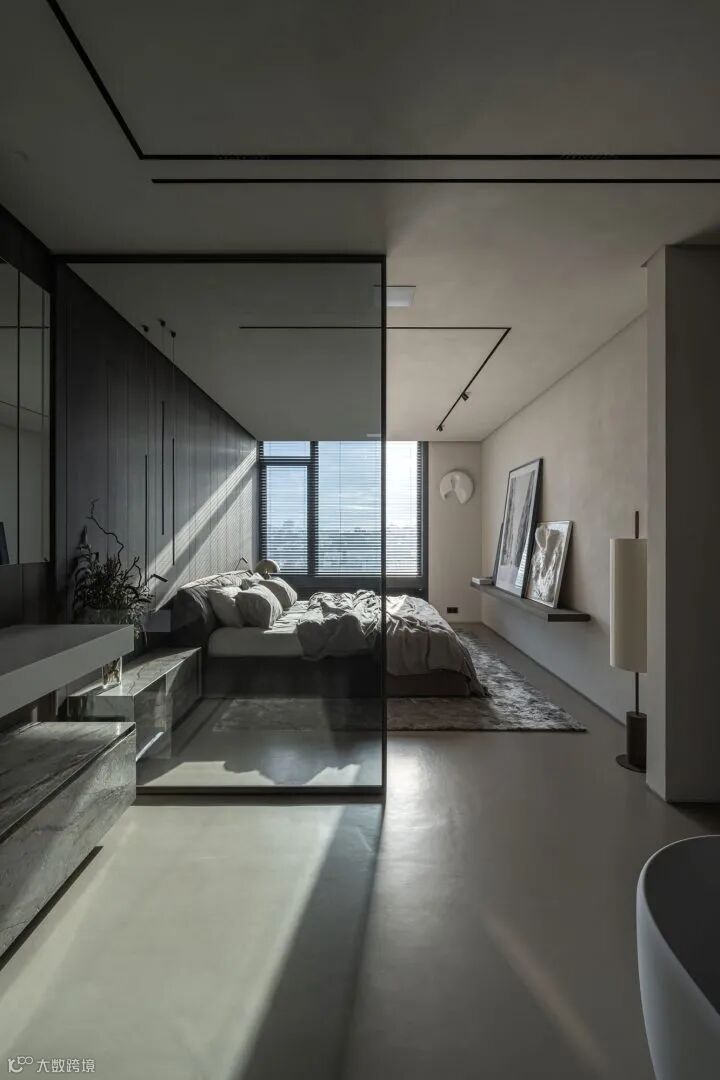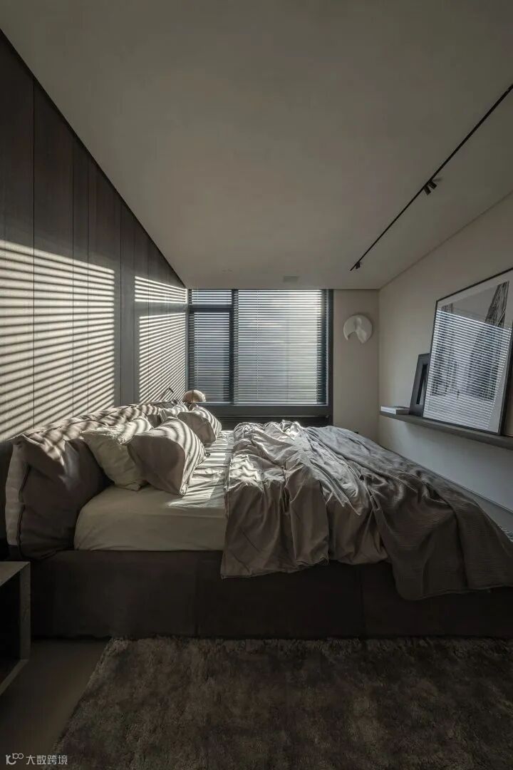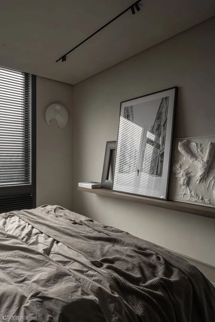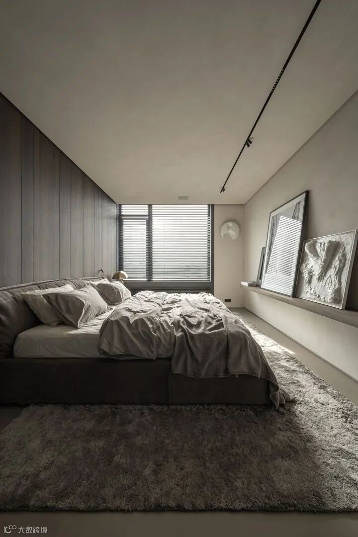由极简表现奢华,是YoDezeen的设计语言之一。卧室整体以中性灰进行铺色,没有繁杂的装饰,三两峻秀冷艳是艺术作品,反而更加突出了自然光的作用。