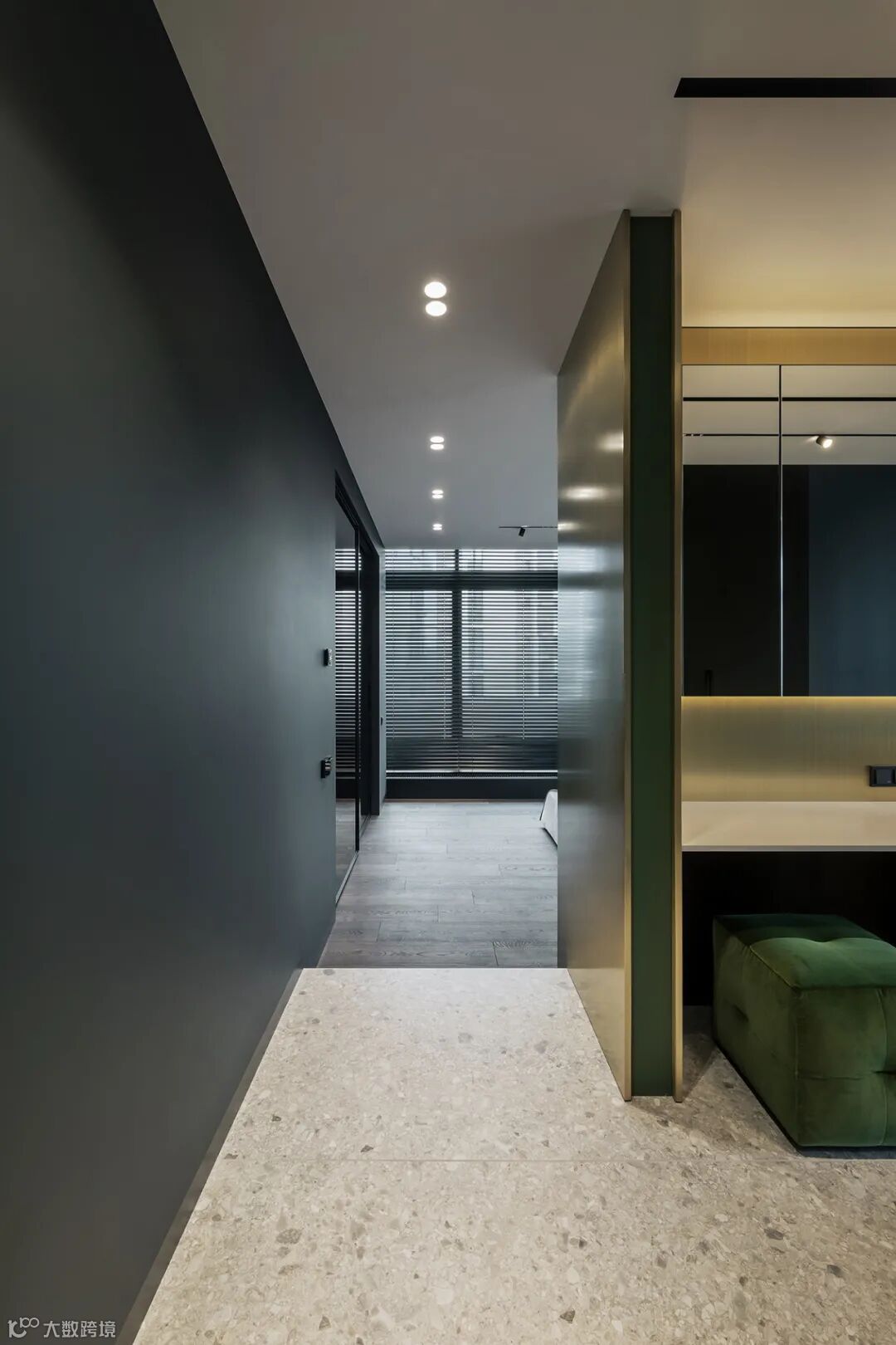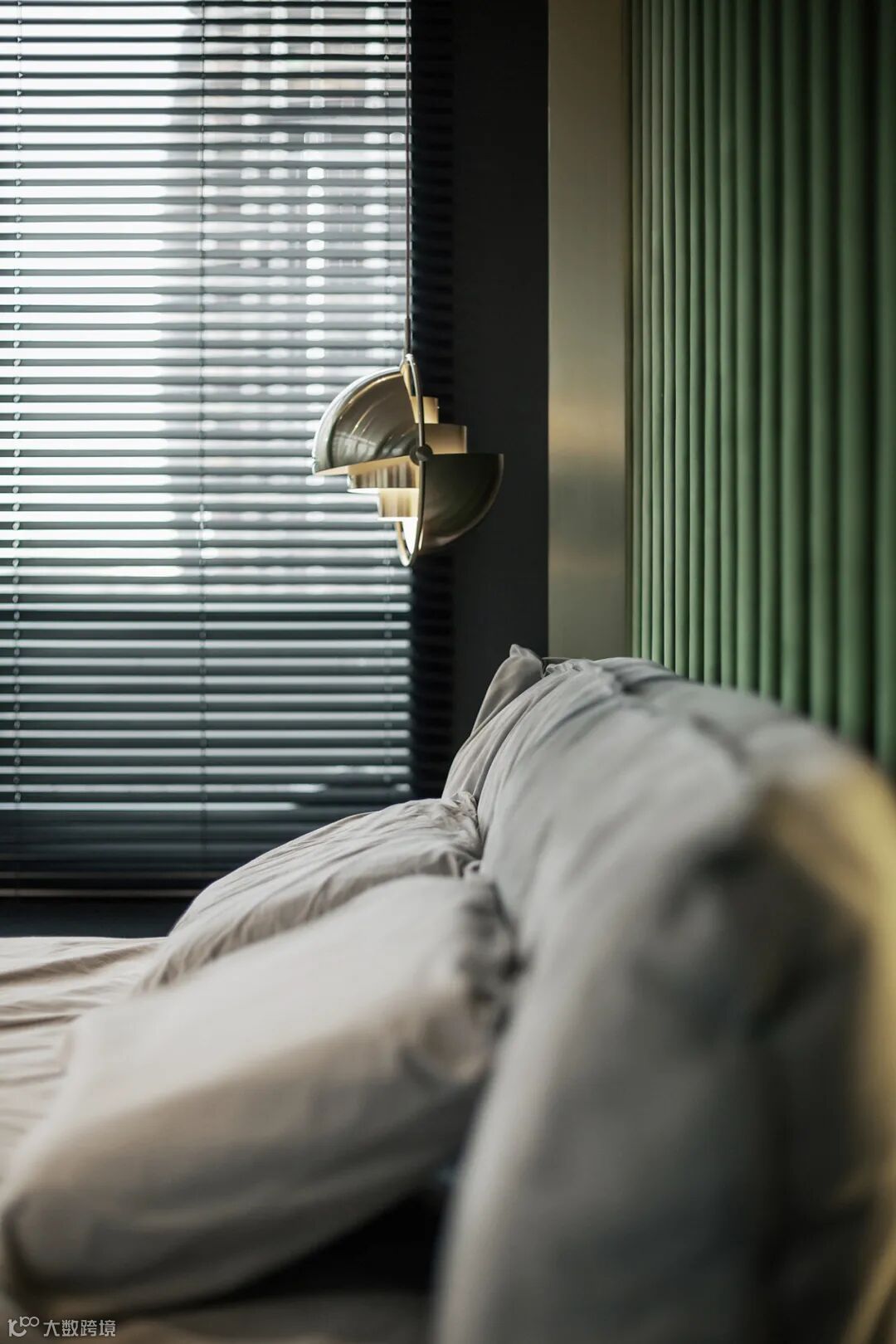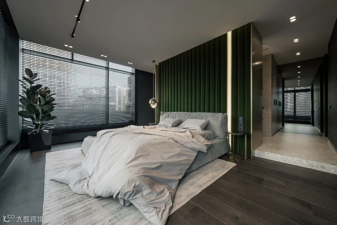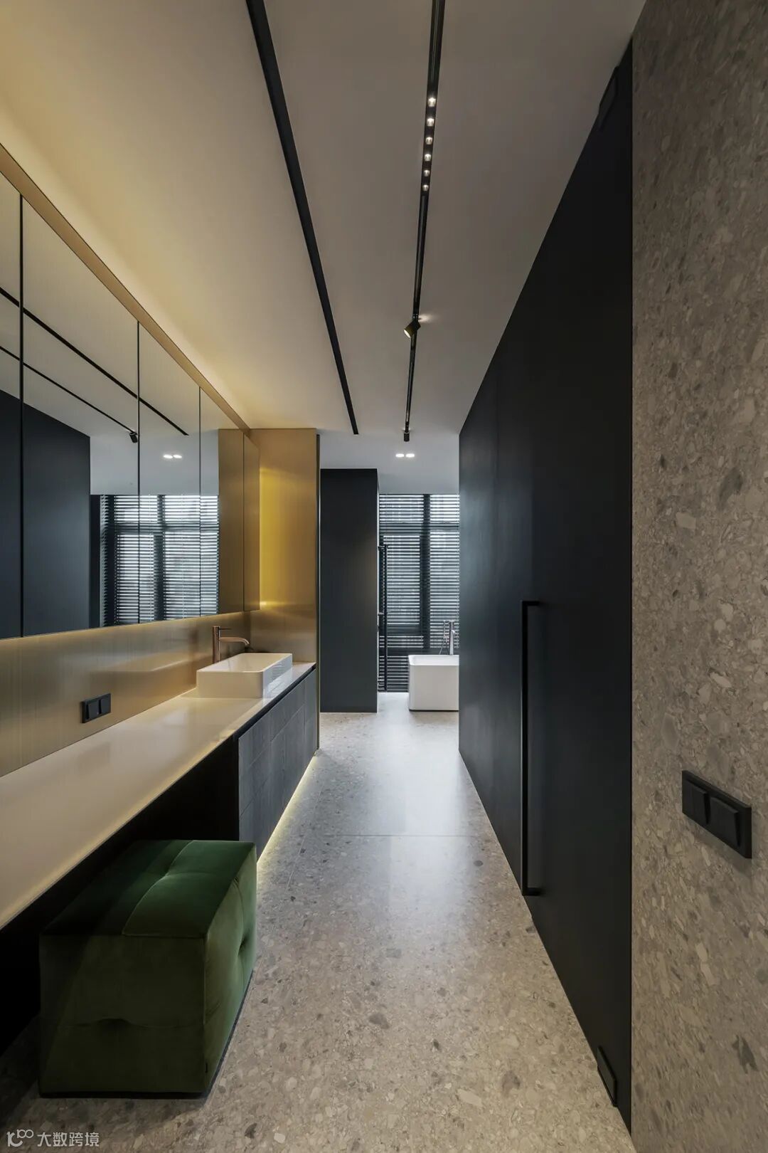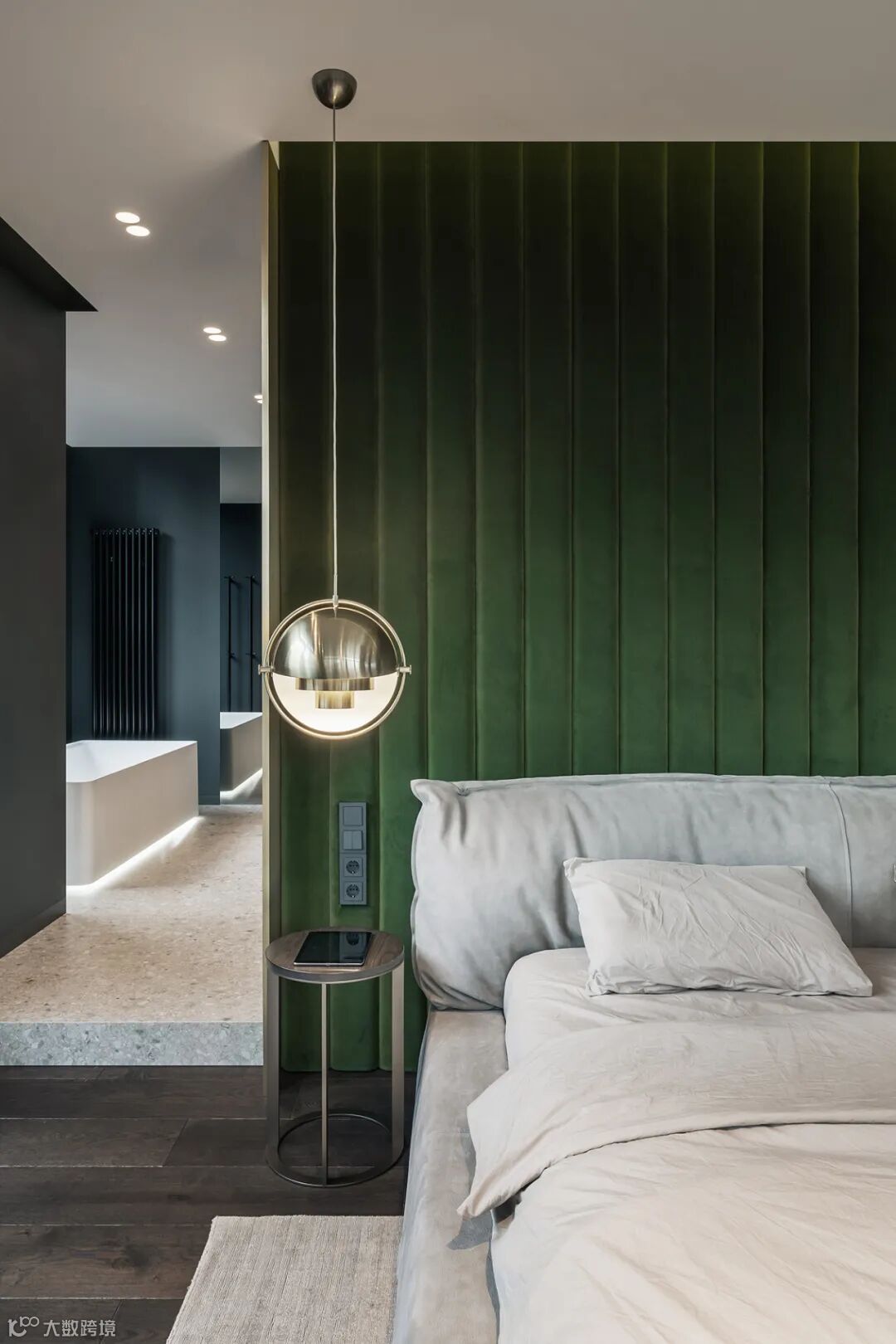 床头金属吊灯与绿色相搭配,充满了高级感。穿过床头的走廊,就是配套的主卫。比起传统的门墙设计,这样的构建更能突出设计师对空间的想象与审美。