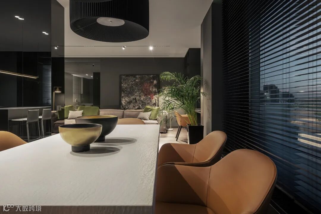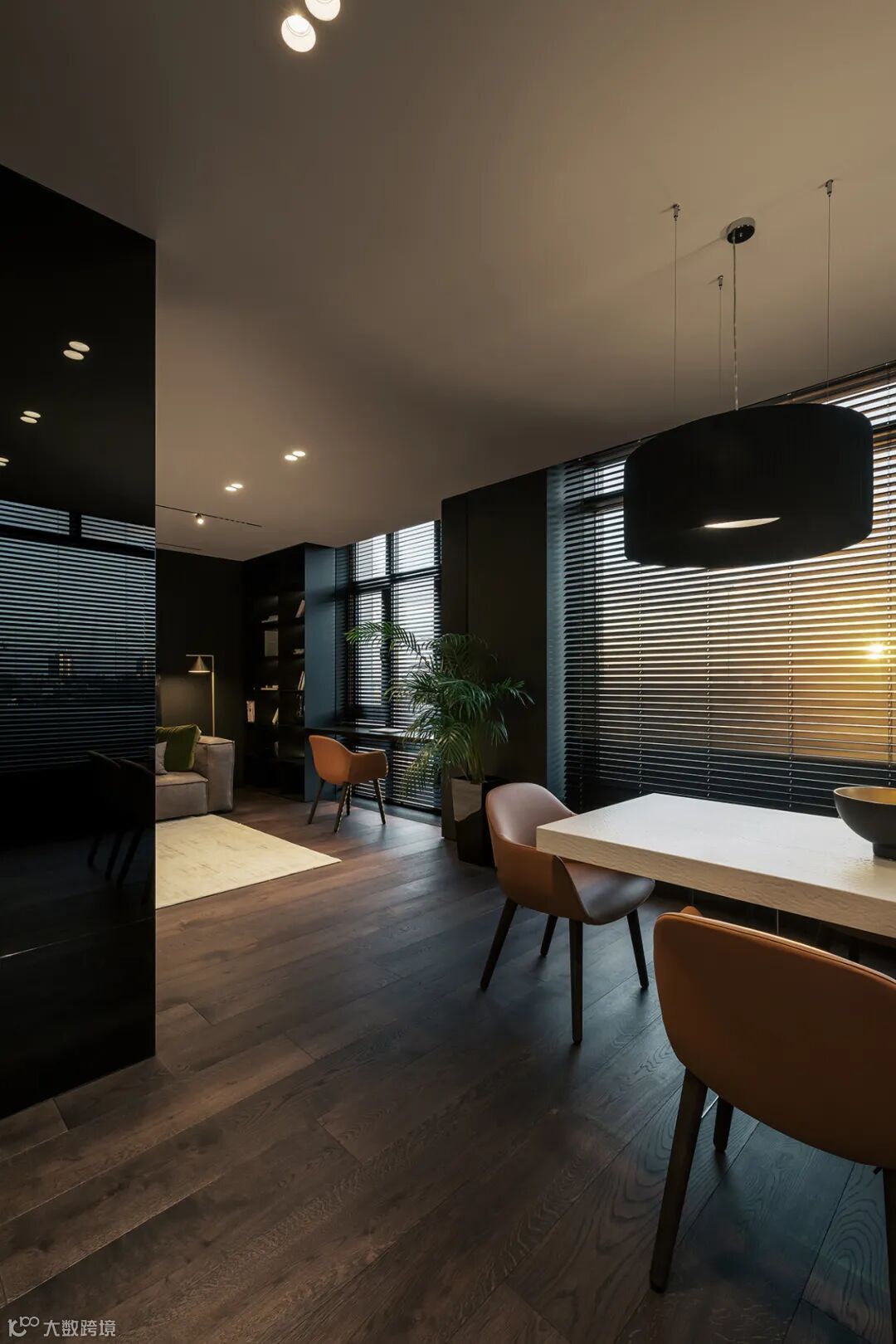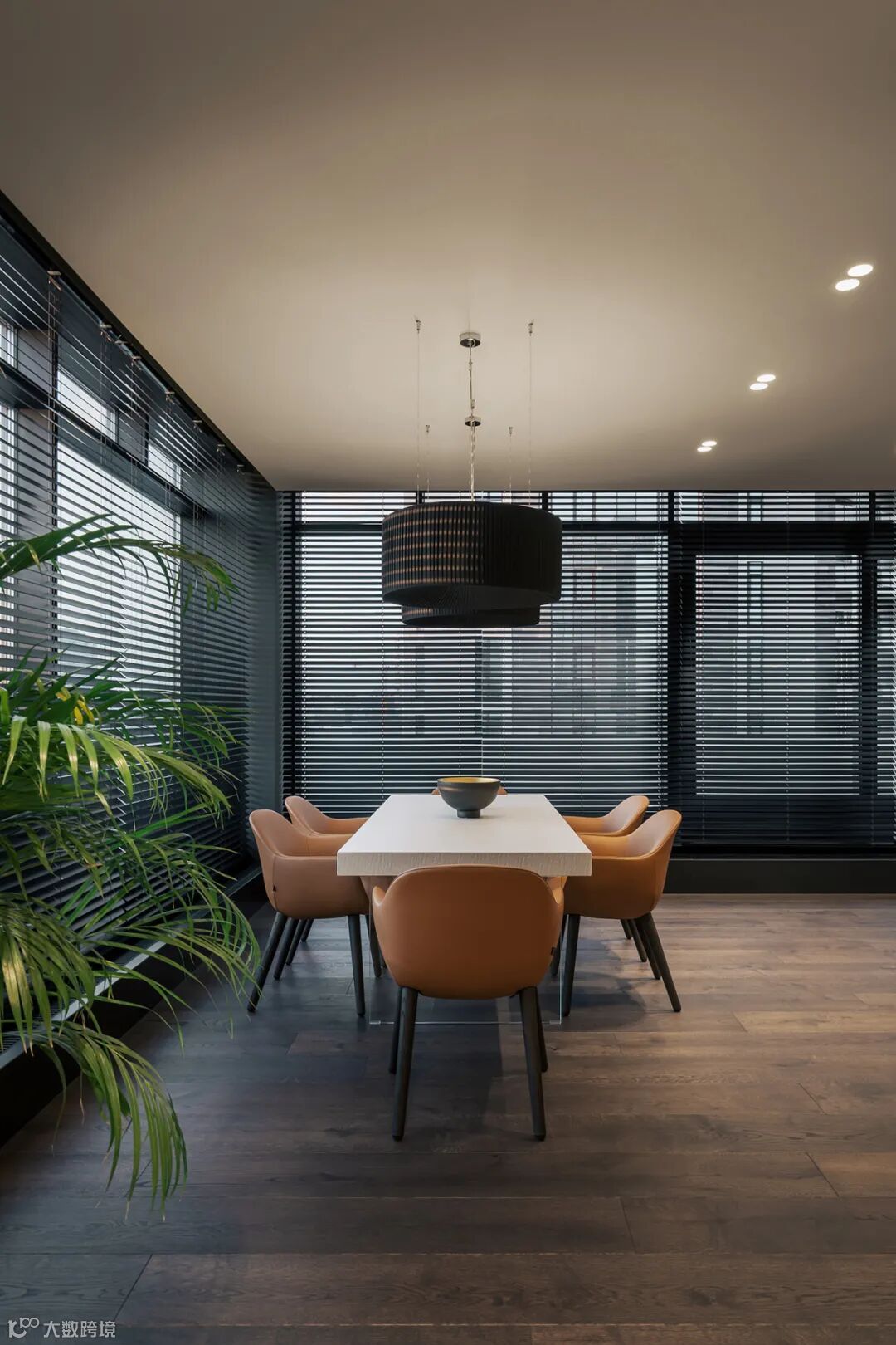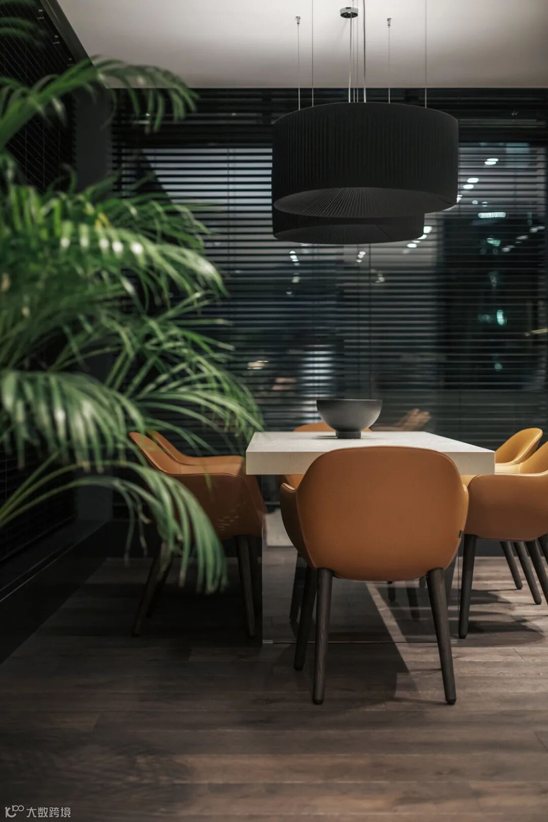 餐厅处从总体色调上跳脱出来,橙色的餐椅和浓绿的植物形成对比,较暗色调的环境又压制住了这种鲜艳,在柔和的灯光下十分有格调。