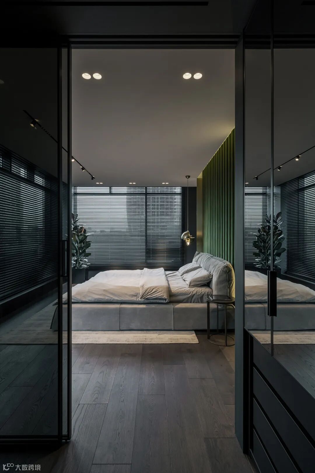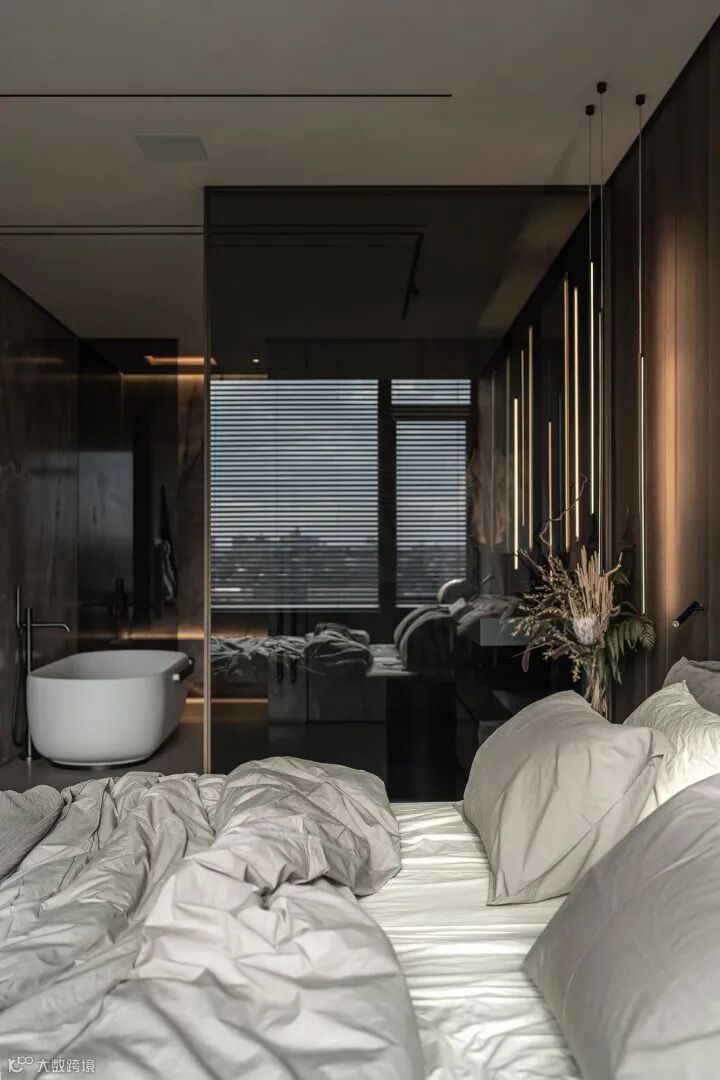 卧室与主卫由石墨玻璃进行分离,玻璃的带来的通透与时尚的效果不容忽视,它不仅是两个功能区的分界线,还是这件作品的装饰语言之一。