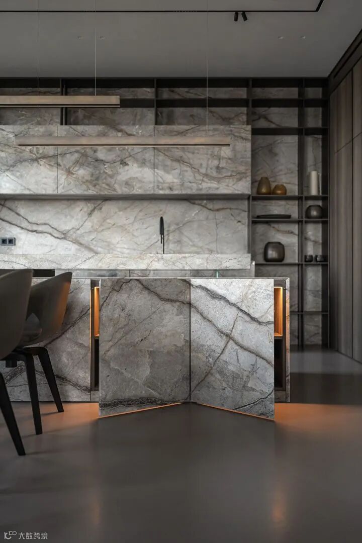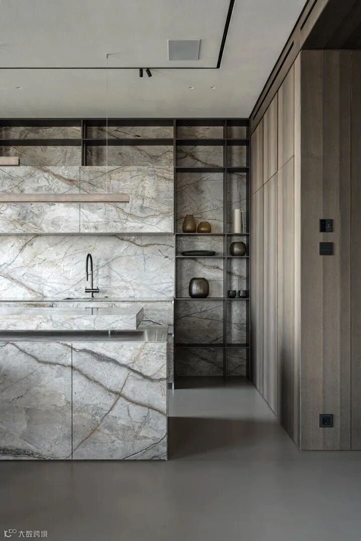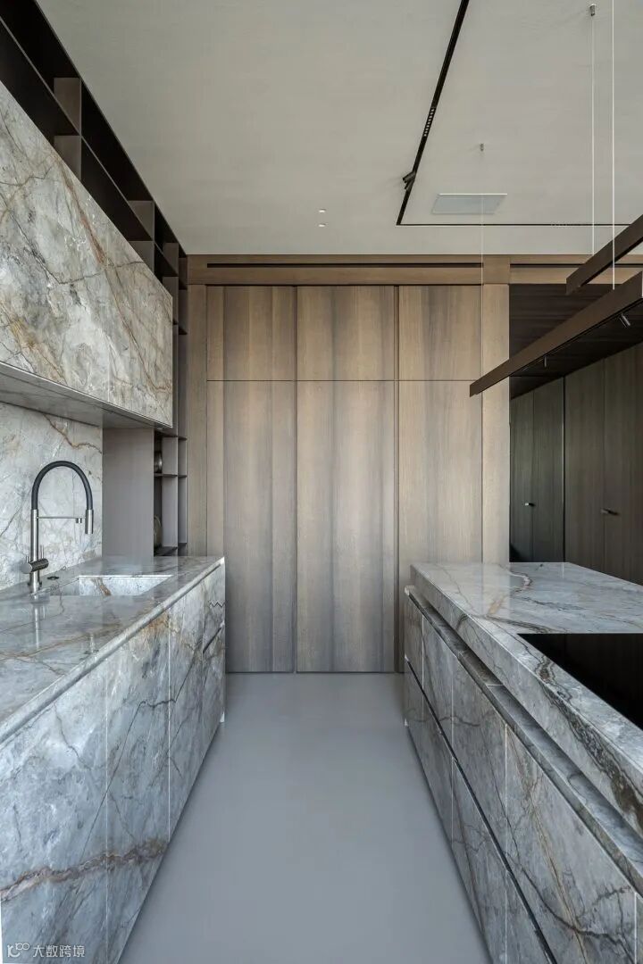 厨房由大理石进行装饰,色调上依然遵循着低饱和度的裸色。