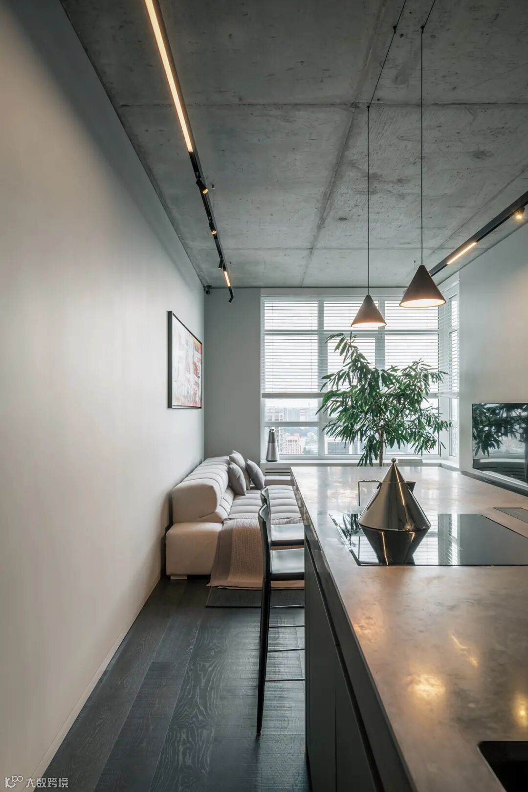 这样的巧思来自于设计师对居住者的关怀及理解。由于厨房区临窗,那么就不得不利用这美丽的城市风光了。坐在餐桌的一侧,在可以和厨房进行很好的互动外,还可以欣赏到美丽的外景。而且在此处可以窥见俄罗斯的落霞,一天的光影变幻,被百叶窗的线条框起来,又释放出无数的光与晕,营造浪漫的奢华。