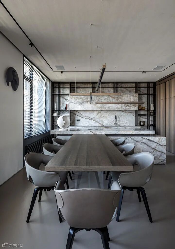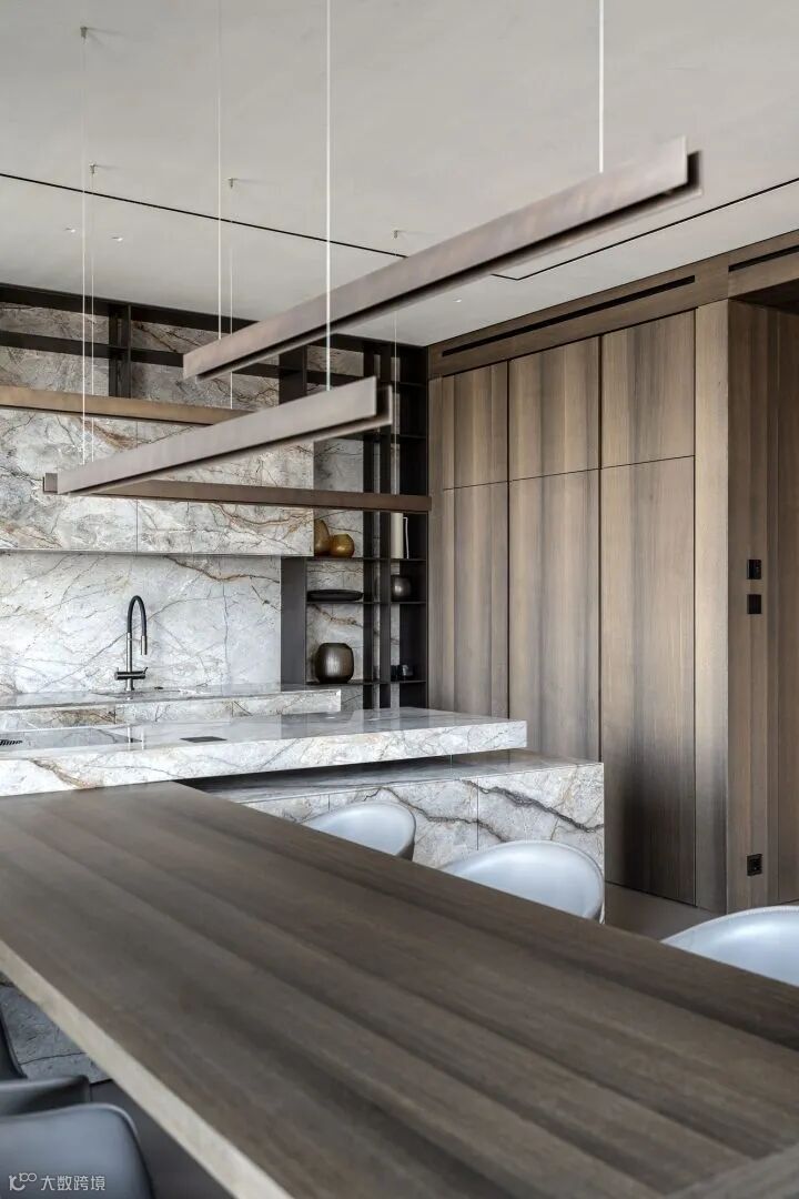 餐桌的桌面与大岛台相接,形成一个略偏的T形,充满了时尚感。木的温润与大理石的奢华在厨房形成了美妙的组合,干净的调色盘之中由不同的纹理展现魅力。