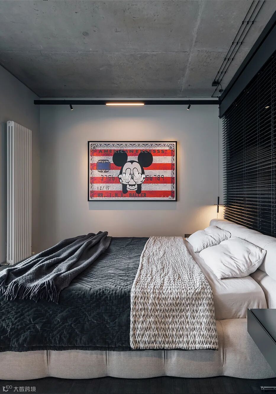 墙上挂着的米奇装饰画,为空间增添了新的色彩,也中和了灰色带来的冷感。它俏皮的动作与气氛,也正好迎合了空间布局的独特。Minimalist Apartment 采用独特风格建立架构,运用了多种元素构建现代极简,这也正体现了设计团队的创意与理念。