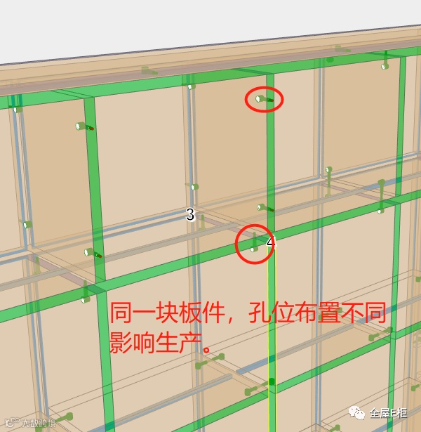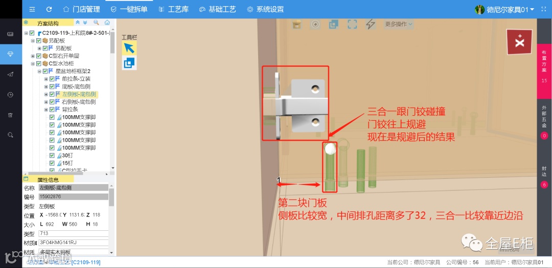 Q557:像这种规避能不能两边孔位同时变化,不然话一头孔距小,一头大。规避孔位还有能否实现翻孔方向孔位置不会变化,铰链孔规避层板位置时,能否实现对称规避,不然门板有方向性,车间生产有很大难度。
