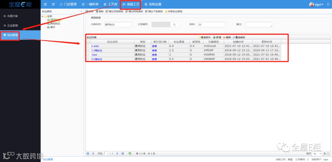 A553:基础工艺-封边管理,可以管理封边,修改封边厚度、预铣等参数,也可以新增封边;