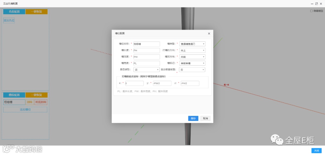 5.2 使用五金配置槽的方式配置。需要把板件配置为不碰撞开槽(栅格条ID:3FO47FMAUD8L)。并为五金添加槽位(需要五金模型请联系运营)。
