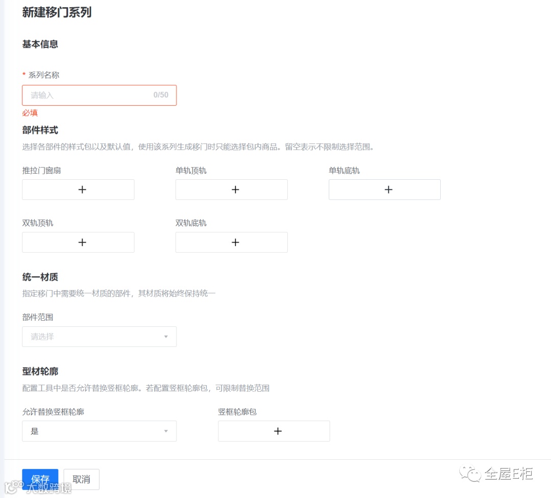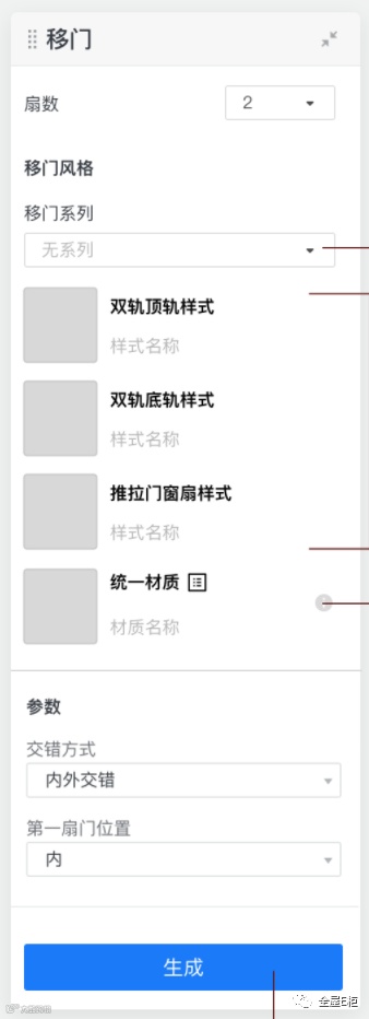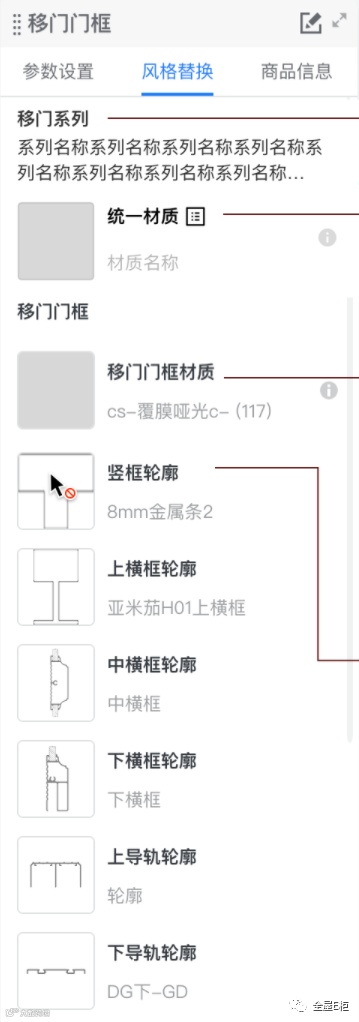 1.配置一个系列下的门扇、导轨的样式,同时在生成移门时选择系列,来实现门扇、导轨的样式关联。