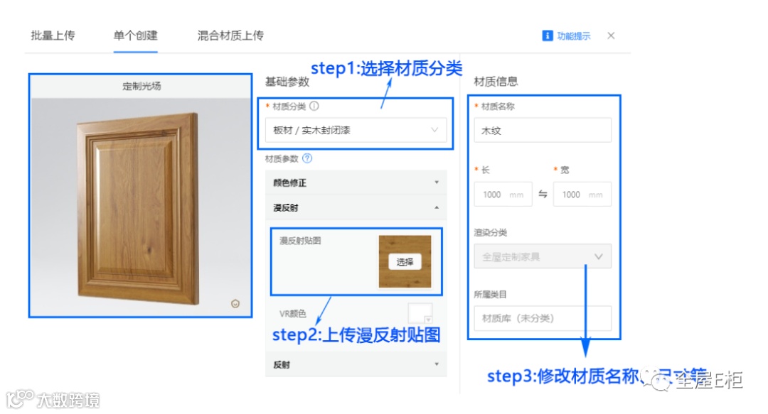 选择材质分类→修改漫反射贴图→预览效果→确认材质名称与尺寸信息;