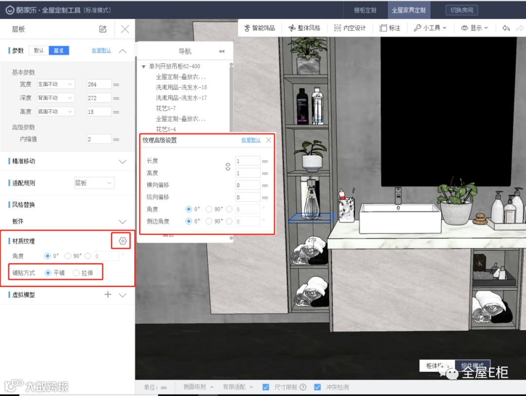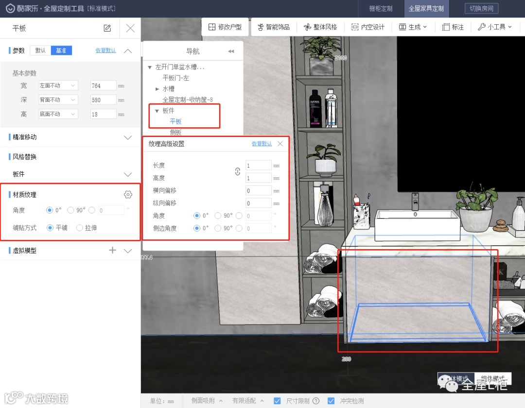 全屋定制工具内可以对“所有板件”及“平板门”进行贴图纹理的修改。