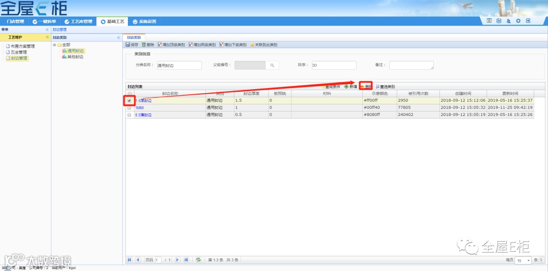 1.3.2删除:如需删除,勾选对应封边后,点击删除按钮。