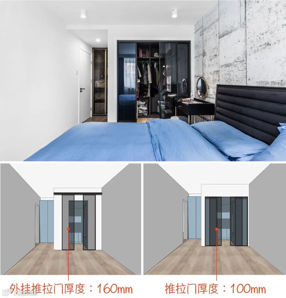 还有这家的卧室衣帽间,用了四扇推拉门,虽然造价更高,但是比砌墙薄了6cm。