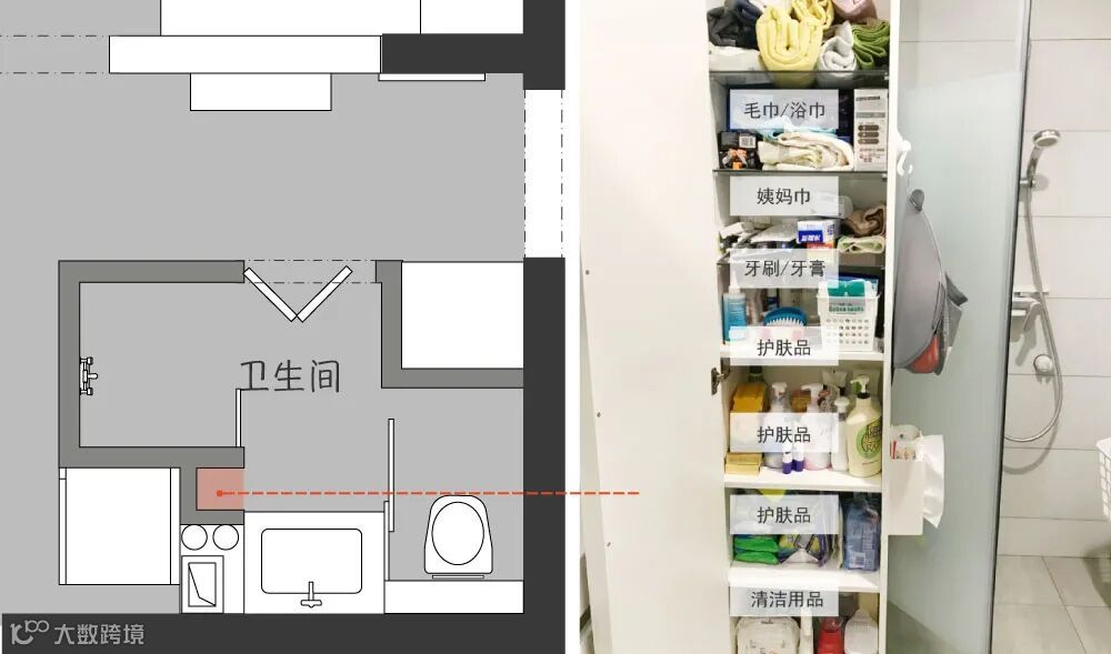 还有这家的卫生间,凹角也充分利用上,定制了260cmx260cm的顶天立地柜,实用又能装。
