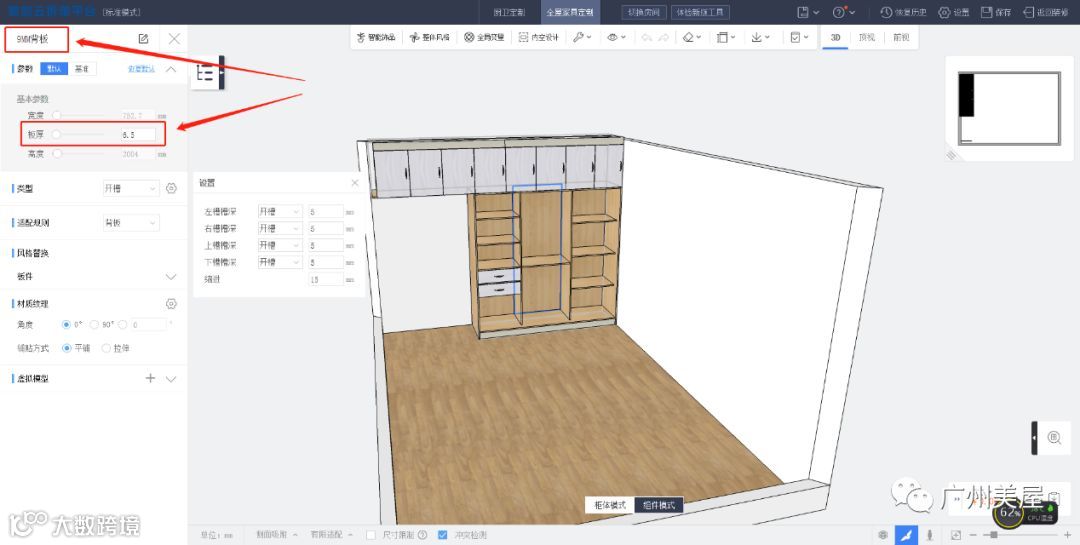 A222:首先放板顺序需要根据掩盖方式定先后,置入板件后可在左侧参数栏更改其适配规则,如有尺寸限制,可先取消下方的尺寸限制选。