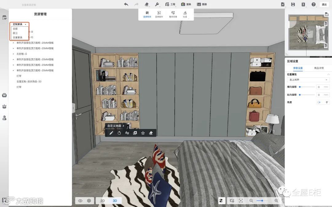 单击进入【资源管理】左上角可以选择厨卫或者全屋家具,下图所示是选择全屋家具: