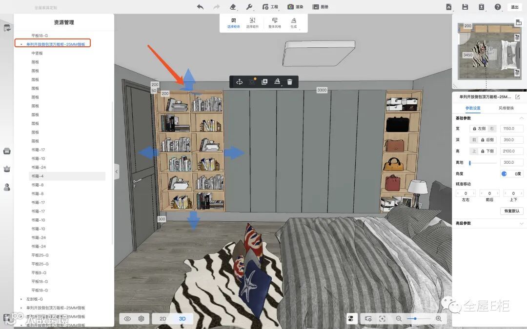 同理选择【单列开发侧包顶万能柜-25MM侧板】场景内即可看到该信息对应下的模型—