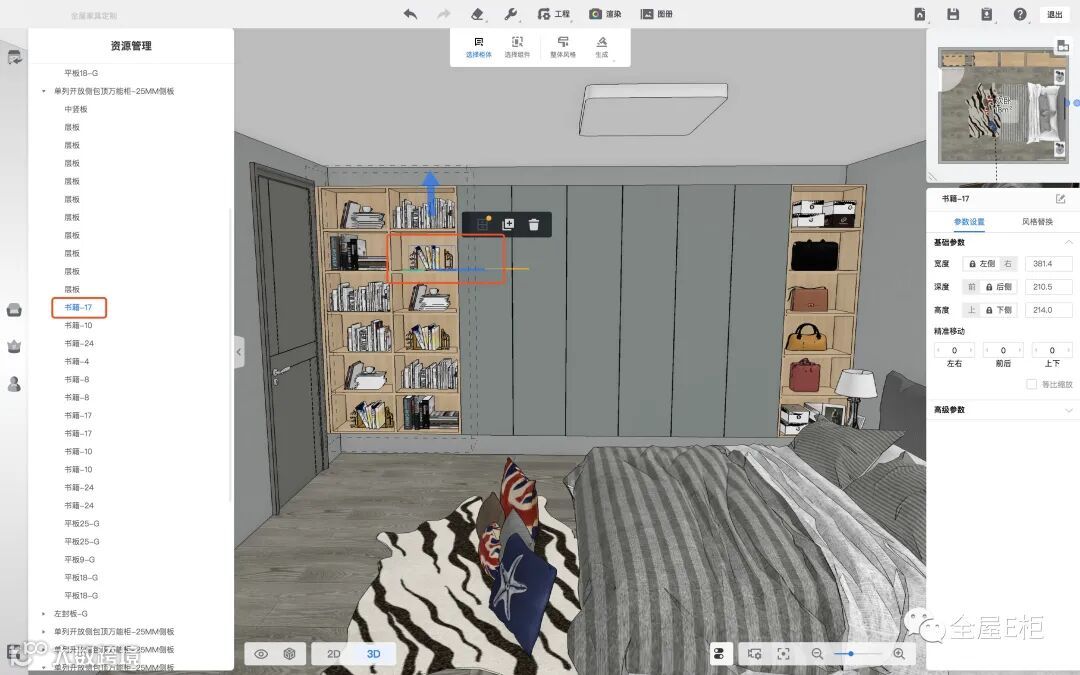 选择全屋家具后,就可以看到方案中所有产品信息,有时候我们在很难选中模型或饰品时可以通过资源管理轻松选中想要的模型。如下图所示就是通过选择左侧栏资源管理里的模型信息,在3D场景内就会显示该信息对应的模型:
