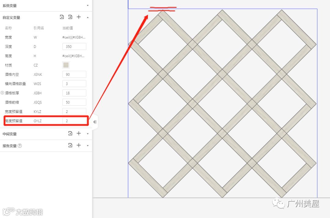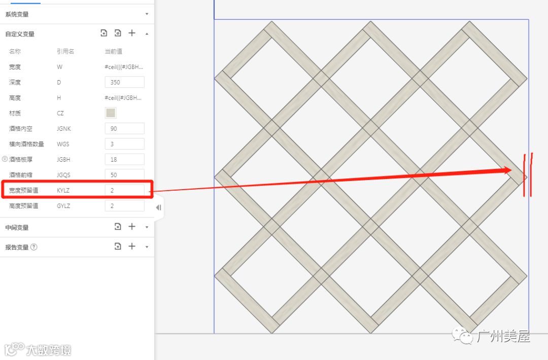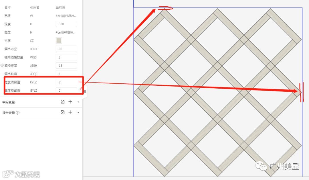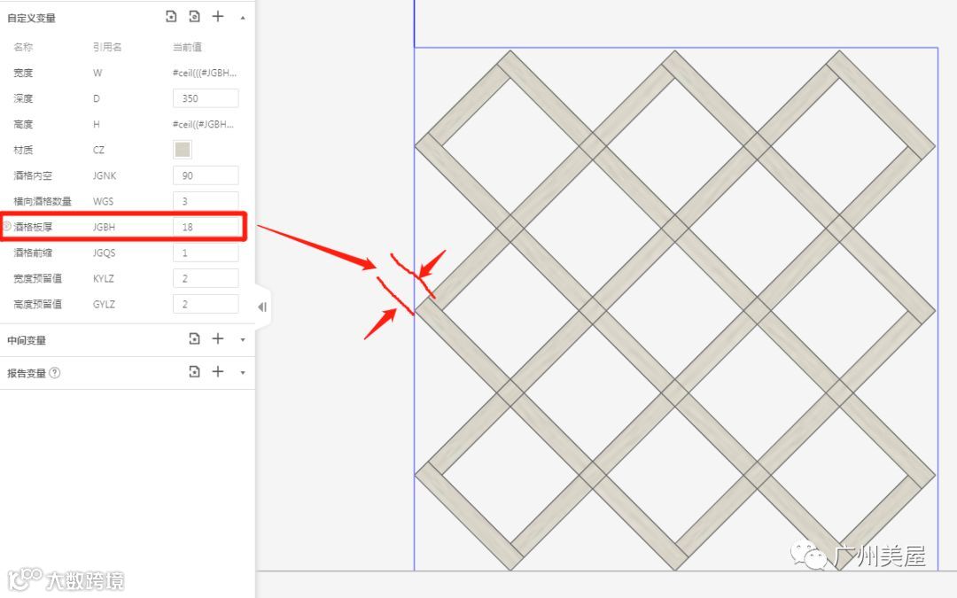 针对这种情况我们更新了以下“菱形酒格-1”,高度方向按格数划分模型,宽度方向格数可调。宽高尺寸自动按格数、板厚、内空等参数计算得出,按这个数值调整内空,方便快捷。