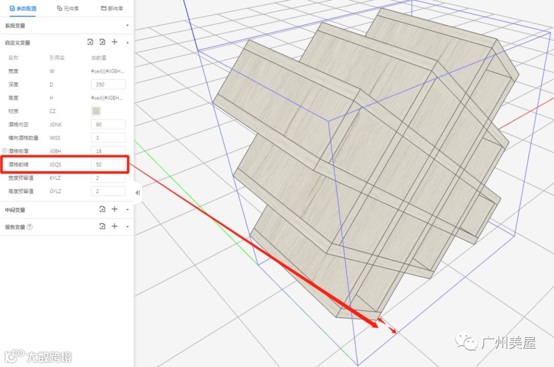 2.1、宽深高:宽高由酒格内空尺寸、板厚、酒格数量、宽高预留值计算得出,所以前端应用不可直接调整酒格的整体宽高,可调参数酒格内空尺寸、板厚、酒格数量、宽高预留值。