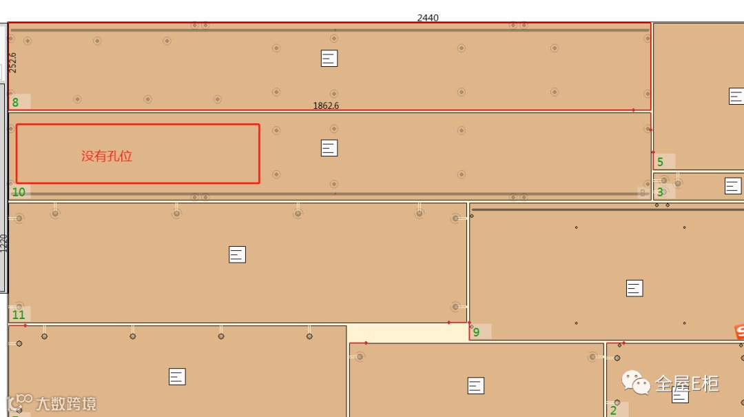 审核工艺与拆单操作的顺序原因,审核工艺中斜层板添加了左侧的布置方案后前往一键拆单,此时右立板没有斜层板的胶粒孔,再返回审核工艺添加斜层板的右侧布置方案,但没有重新拆单。造成拆单数据没有更新。