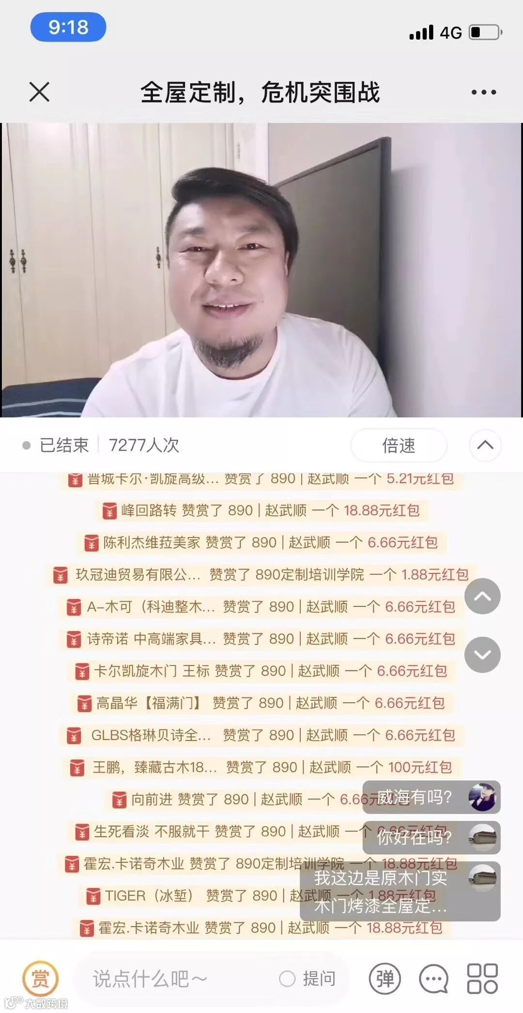从2月9日起,每晚8:00-9:00,上百个群、近万人次在线收听赵武顺老师的直播课;2月16日,赵老师更特邀木作抖音大伽闫方炜谈抖音运营经验,让全屋E柜的许多客户忍不住在线打赏,“少走很多弯路、省很多钱,更坚定通过抖音拉动新业务增长的可能”!!