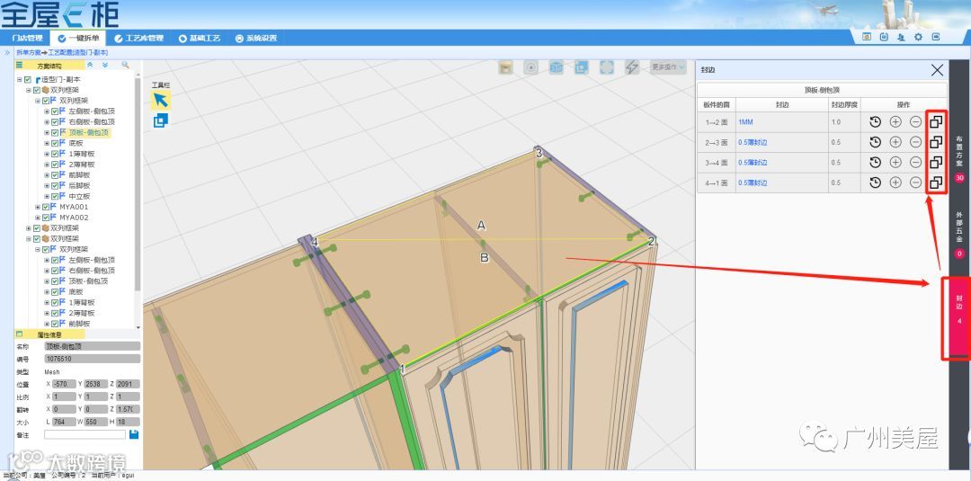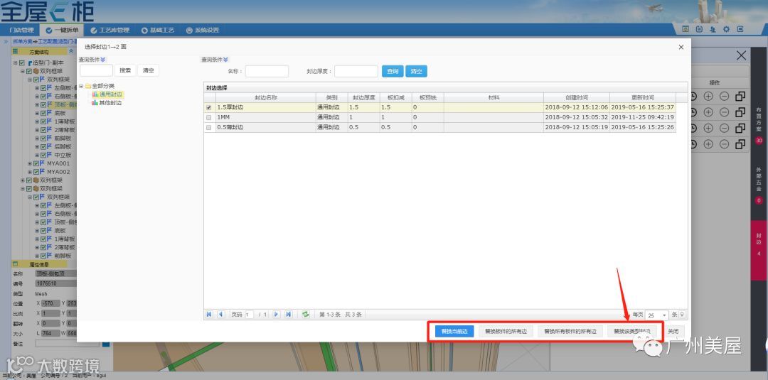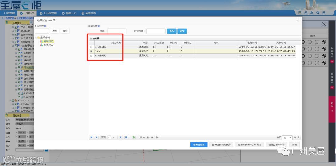 将勾选的封边替换当前选择替换的封边,如方案中有大量原封边为“1mm白”,但需要把"1mm白"封边全部替换为“1mm黑”,则可通过此功能实现。