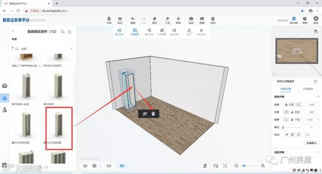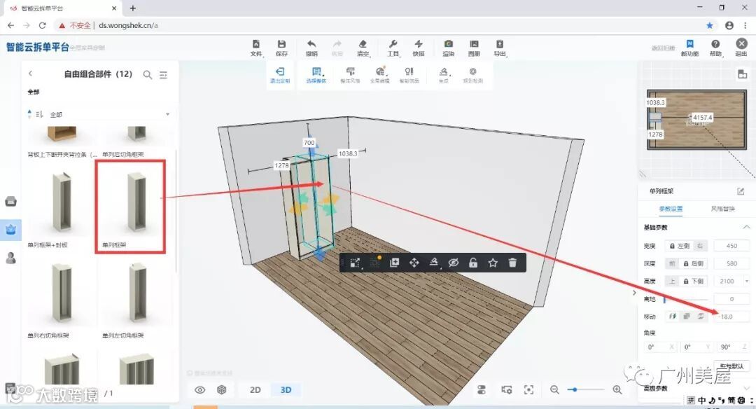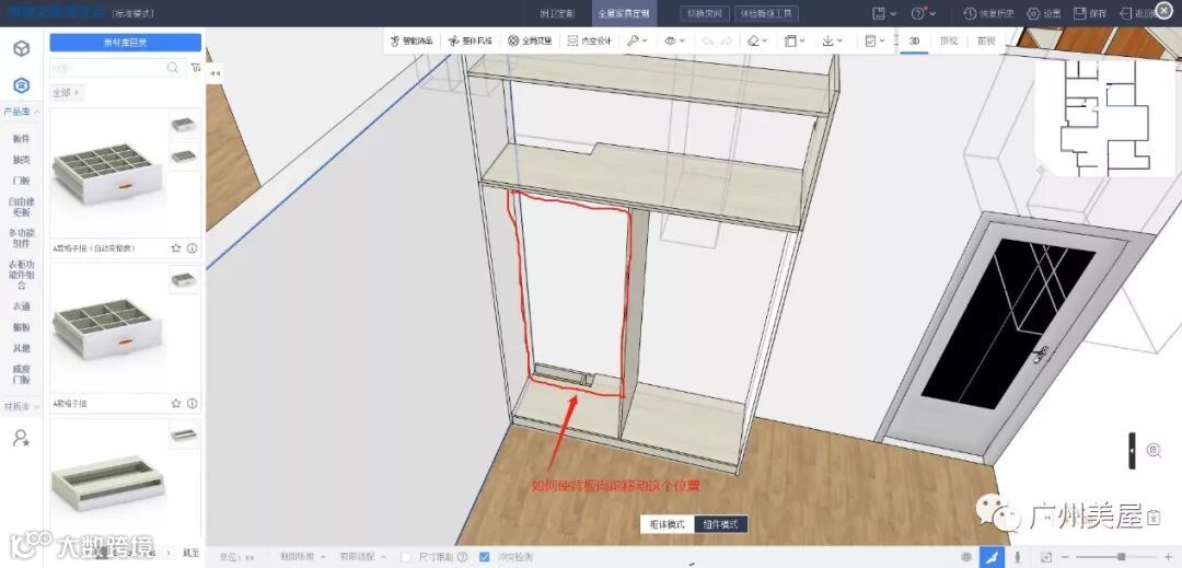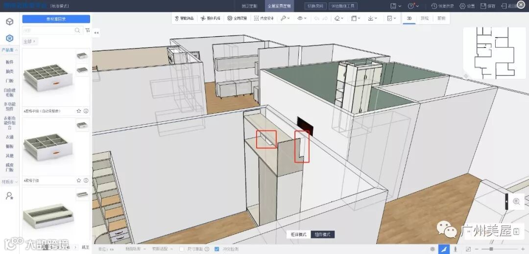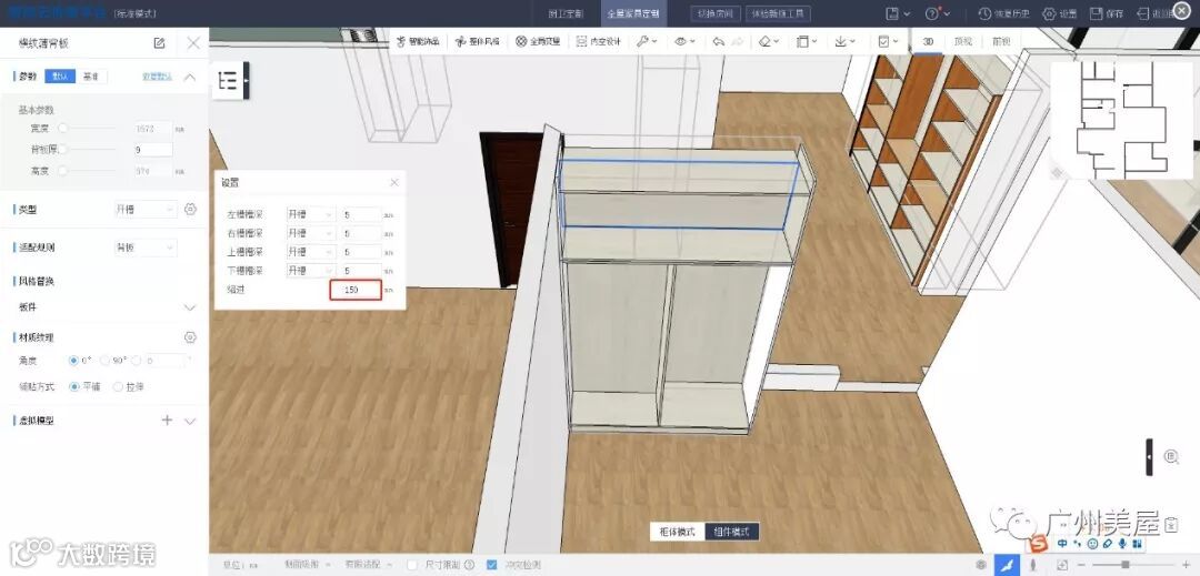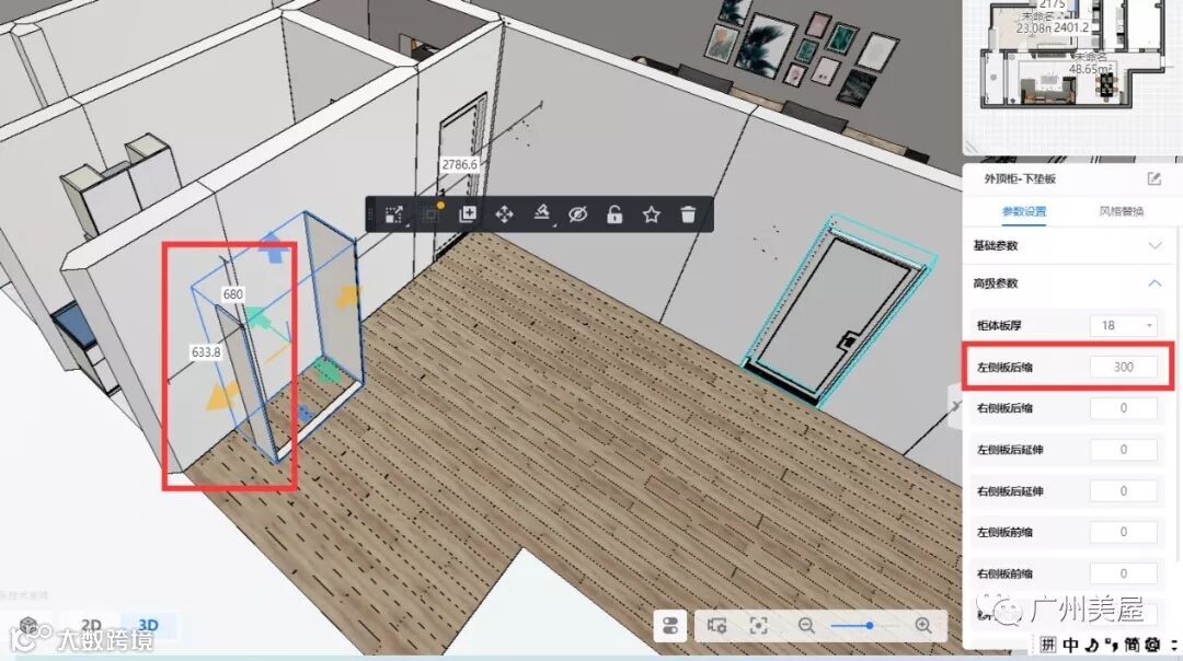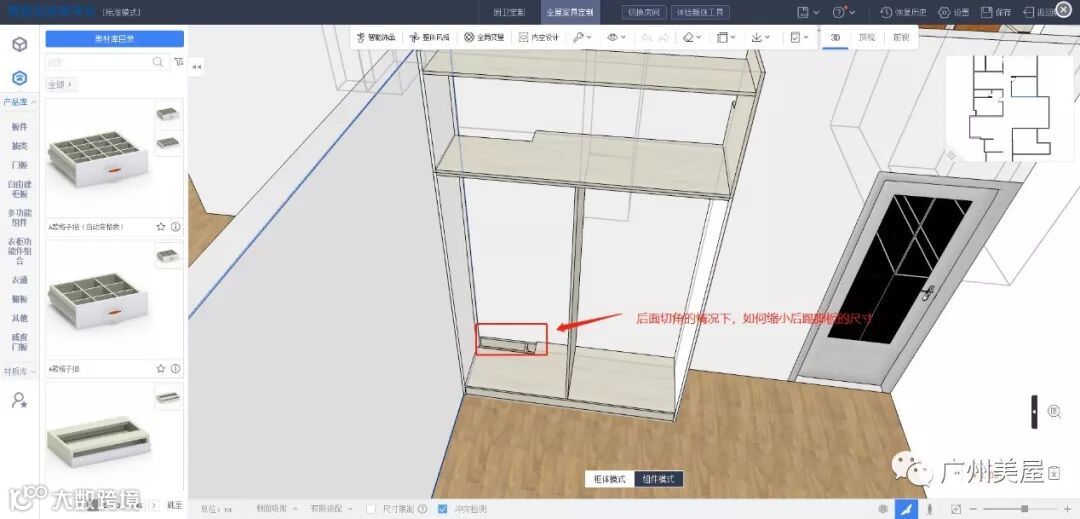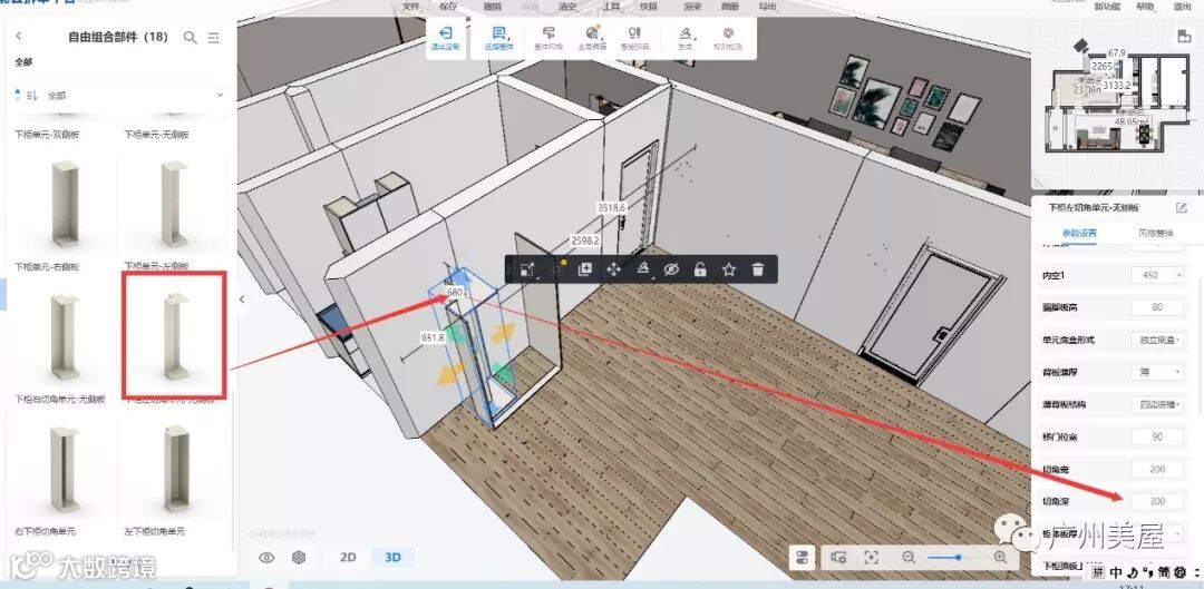 这样就下柜就能够匹配了,然后你拉一个避梁柱的顶柜,在高级参数里面输入相关的参数就可以了。这样你就无需用自由组柜模式,而且这样效率会更高,而且拆单得准确性更好。当有模块的时候,模块话组柜无论从效率还是准确性都会更好。