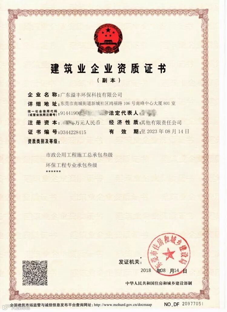 经过为期半年的积极筹备,广东溢丰环保科技有限公司获得东莞市住房和城乡建设局审批颁发的市政公用工程施工总承包叁级、环保工程专业承包叁级资质。