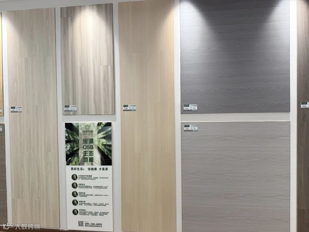 走到区域中间,一张“宝源OSB生态地板”的介绍海报会告诉你这些木地板的“内核”: