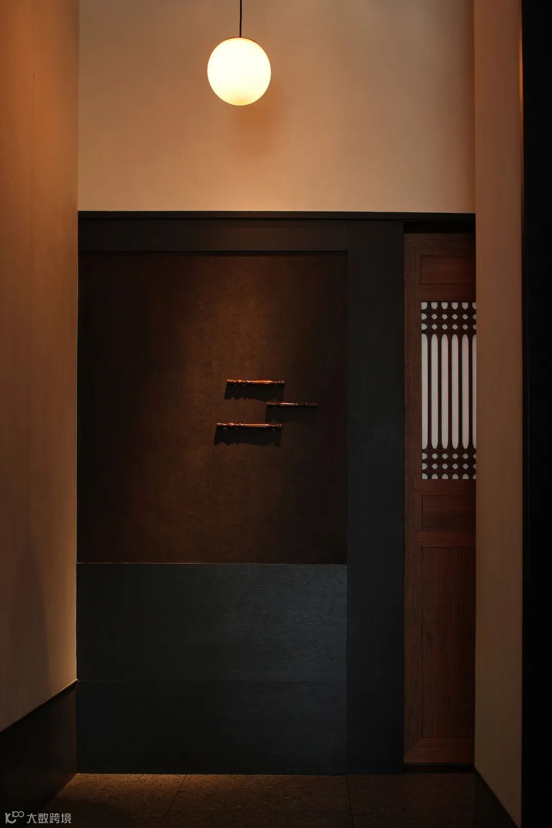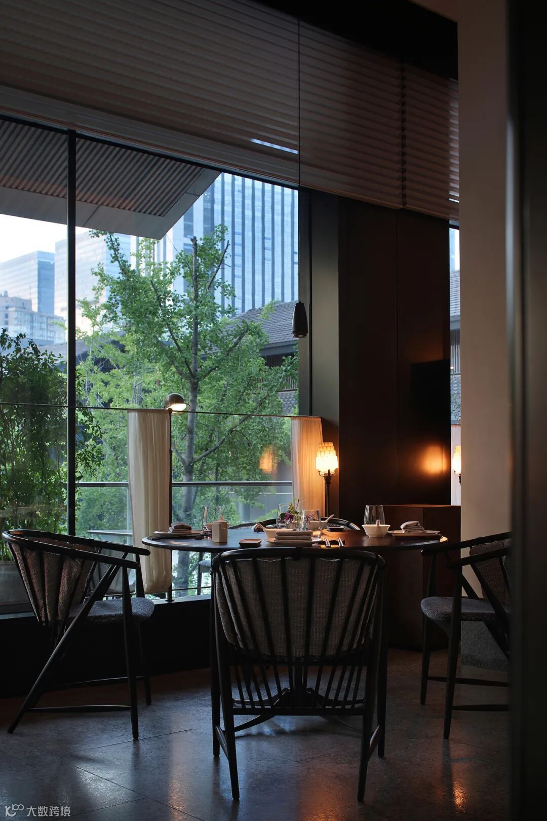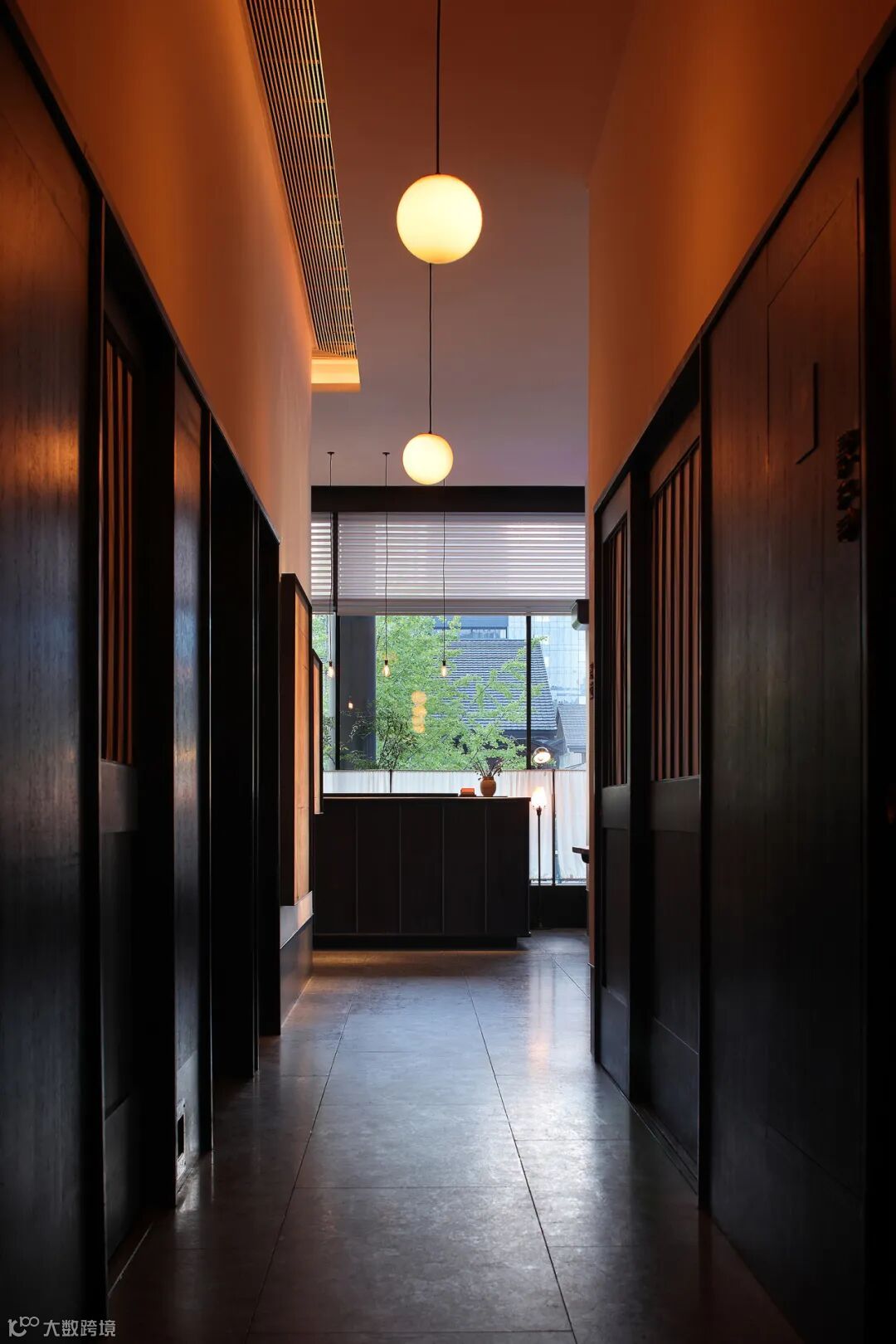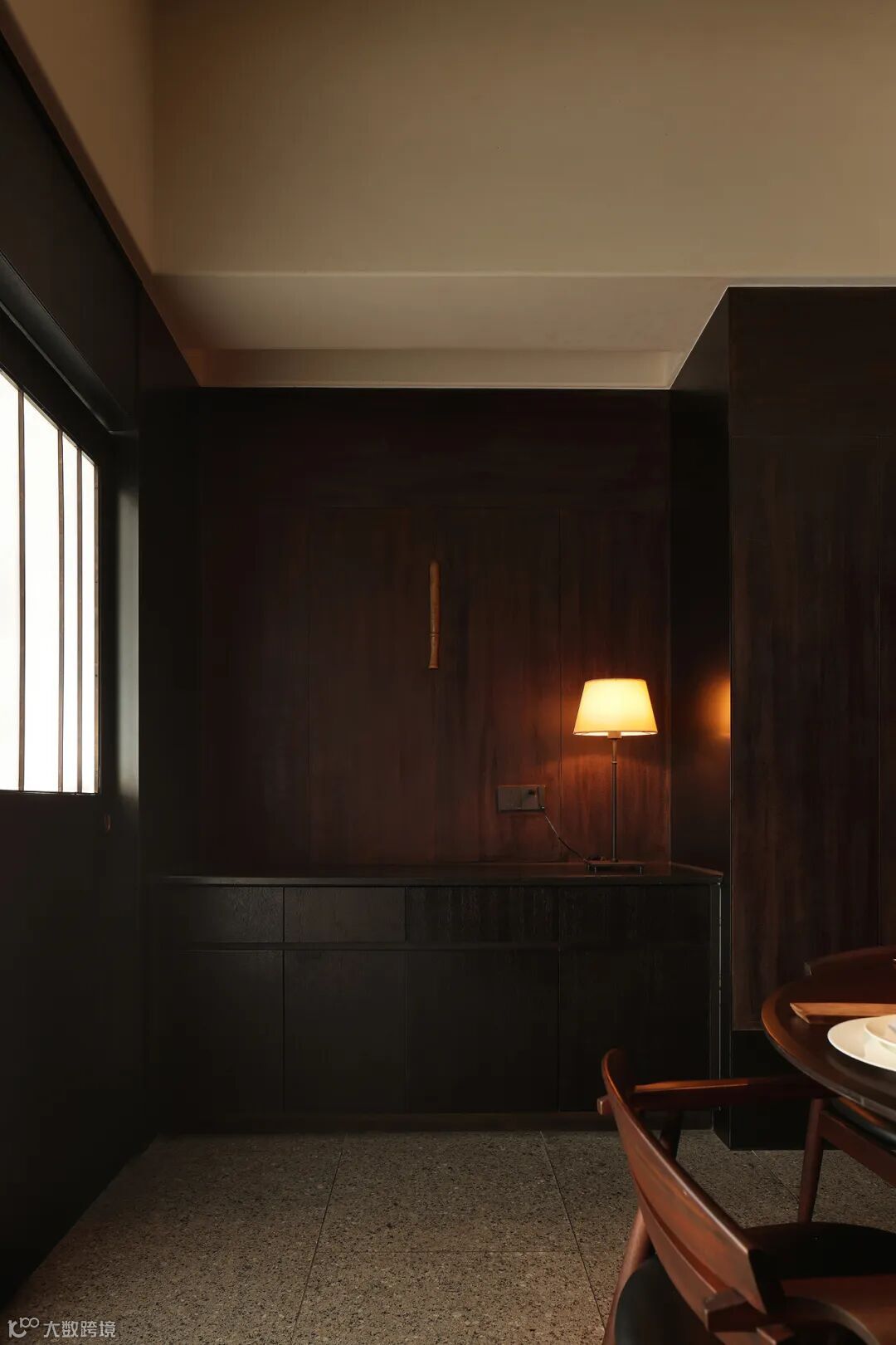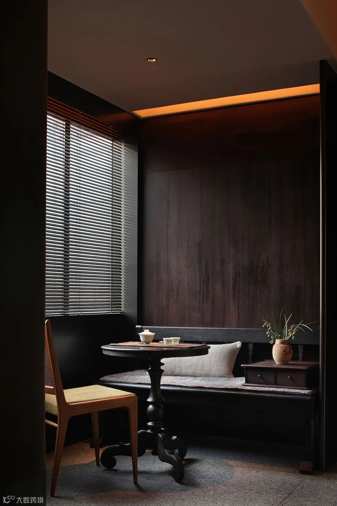 步入整个空间,是悠闲自在的,暖棕色的主基调连同微暗薄明的光环境,充斥着满满的中古韵味,进门处的端景,用萤萤灯火的艺术语言点出空间的精神内核,铸就东方风雅,和窗景交叠,相映成趣。