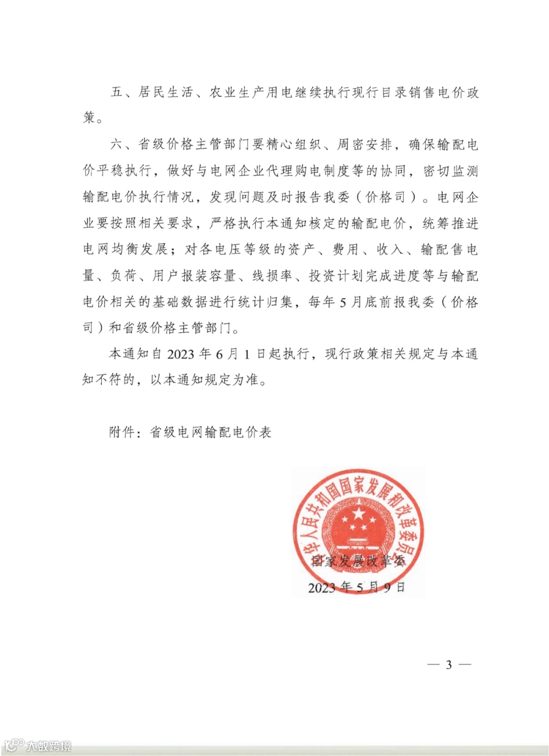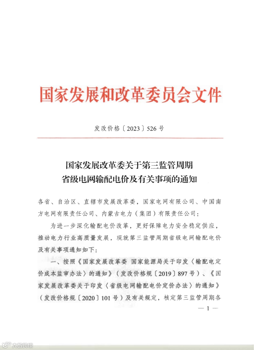 《国家发展改革委关于第三监管周期省级电网输配电价及有关事项的通知》(发改价格〔2023〕526号)原文如下: