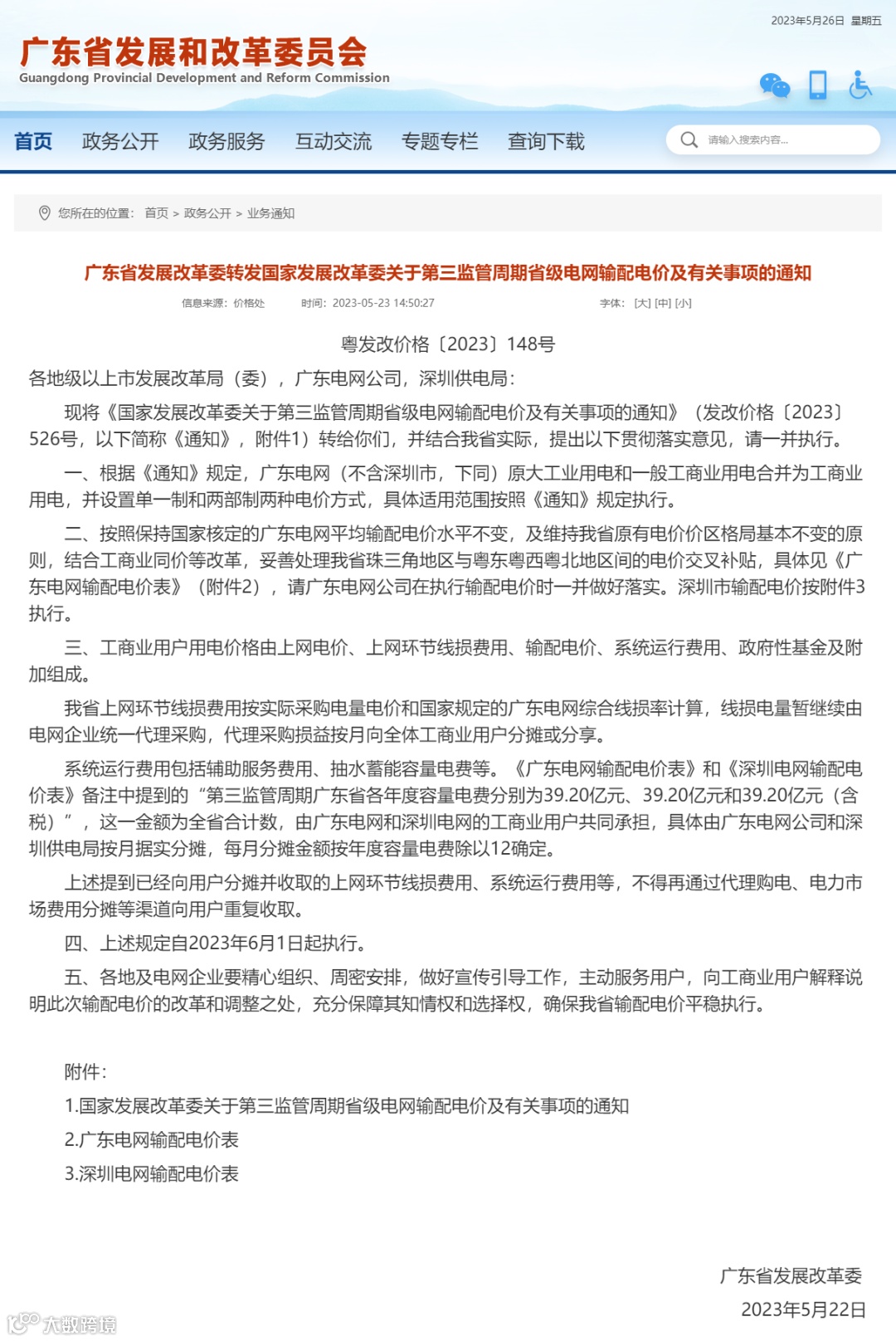 《广东省发展改革委转发国家发展改革委关于第三监管周期省级电网输配电价及有关事项的通知》(粤发改价格〔2023〕148号)原文如下: