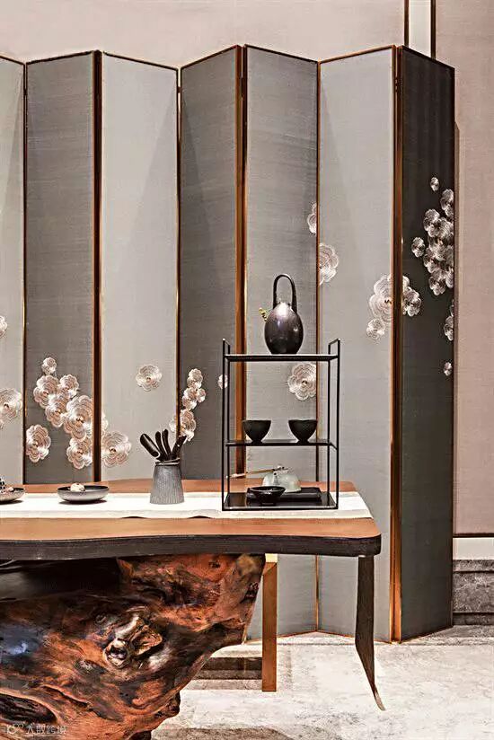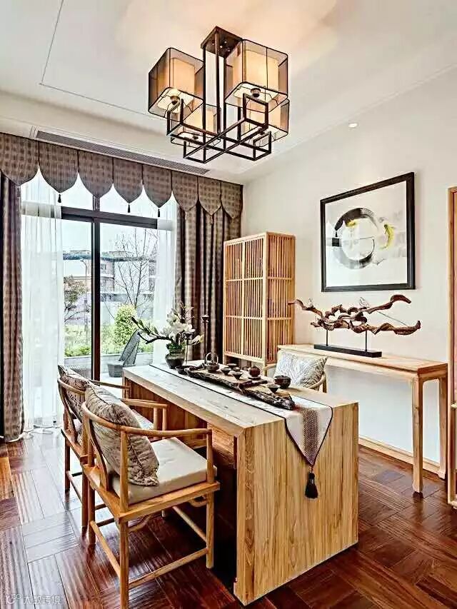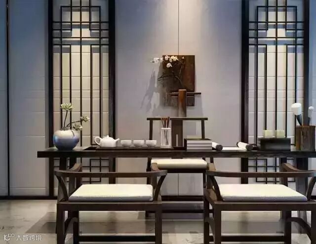 在小摆设的搭配上可以选用紫砂茶壶或是细腻的青瓷盖碗,选择一些带有花草、字画、瓷器、古琴等的装饰,适当搭配,会使气氛显得温婉和谐,情趣盎然,渲染出古色古香的氛围。