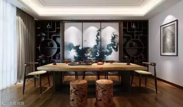 中式茶室的设计风格,着重就是要表现一种历史感、一种文化纵深感,材质上一般采用传统的木材为主,简化线条,图案多为图腾纹样等元素,充满着文化气息。当然,也可以适当加入一些现代时尚的色彩与配饰,使整个空间大放异彩。