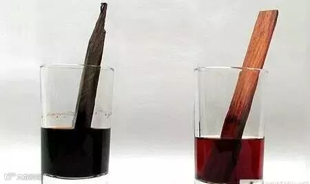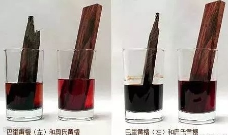 对两者进行酒精浸泡测试可见,交趾黄檀的酒精溶液呈橘红色,而巴里黄檀呈紫褐色至黑褐色,相比外观,这种化学反应上的变化可称得上这两种木材最为明显的区别。