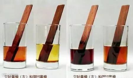 巴里黄檀(左)和交趾黄檀(右)浸入酒精一小时后的颜色对比