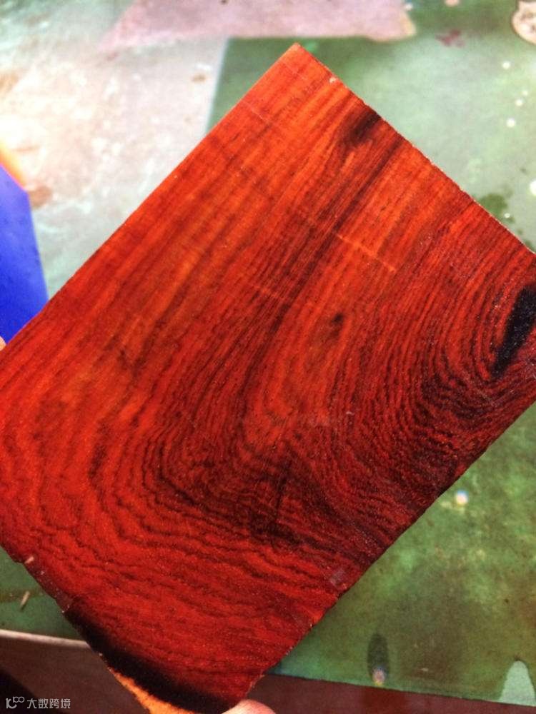 红酸枝黑料呈黑褐色,黑红相间,油性较高,密度大,时有“行云流水”或“老虎皮”等绚烂木纹,但能用的部分较少且难出大料。