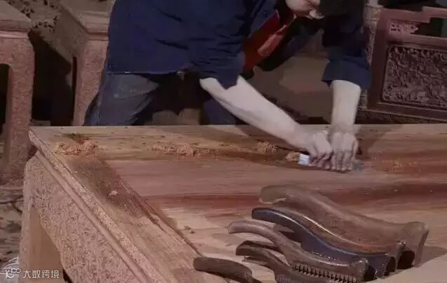 雕刻成型,木料损失18%。家具组装好,在进行擦生漆、烫蜡或喷油漆工艺之前,要进行刮磨,使用十多种刮磨工具进行刮磨,才能使家具平整。