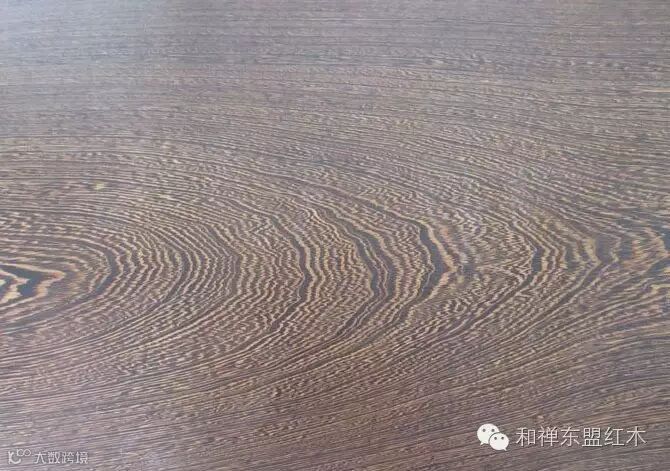 8、非洲鸡翅木(下图):豆科,蝶形花亚科,鸡翅木类,崖豆属,产于非洲刚果。心材黑褐色,常带黑色条纹,纹理通直。
