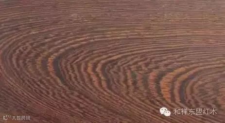 5、牛毛纹紫檀(下图):豆科,蝶形花亚科,紫檀属,紫檀木类,檀香紫檀,产于印度南部,心材鲜红或桔红色,久露空气中变为紫红褐色,常见紫褐色条纹。