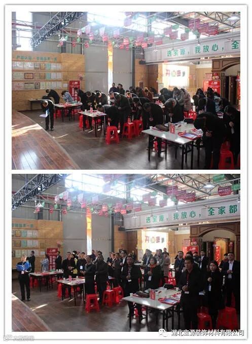 参观完工厂车间来了招商会会场。会议伊始由湖北区域经理聂雪涛带领大家诵读《企业愿景—我有一个梦想》梦想宝源装饰能为行业领军品牌成就百年基业。把握商机就能实现财富梦想,敢于拼搏就能体现人生价值。