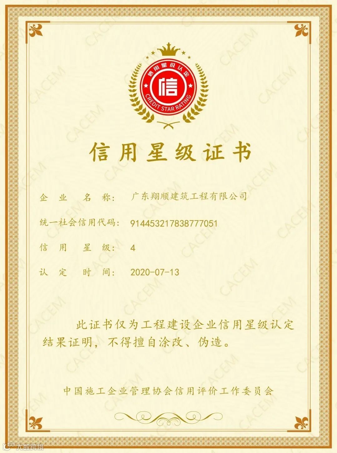 7月13月,我司荣获中国施工企业管理协会信用评价工作委员会发布2020年第二批工程建设企业的信用星级认定为“4星”。10月份再度荣获中国施工企业管理协会公布2020年度工程建设诚信典型企业名单。
