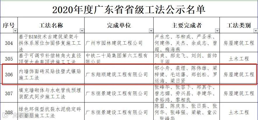 12月,我司提交的《内墙饰面砖双贴挂壁式镶贴施工工法》获得省级工法荣誉,目前已通过公示。