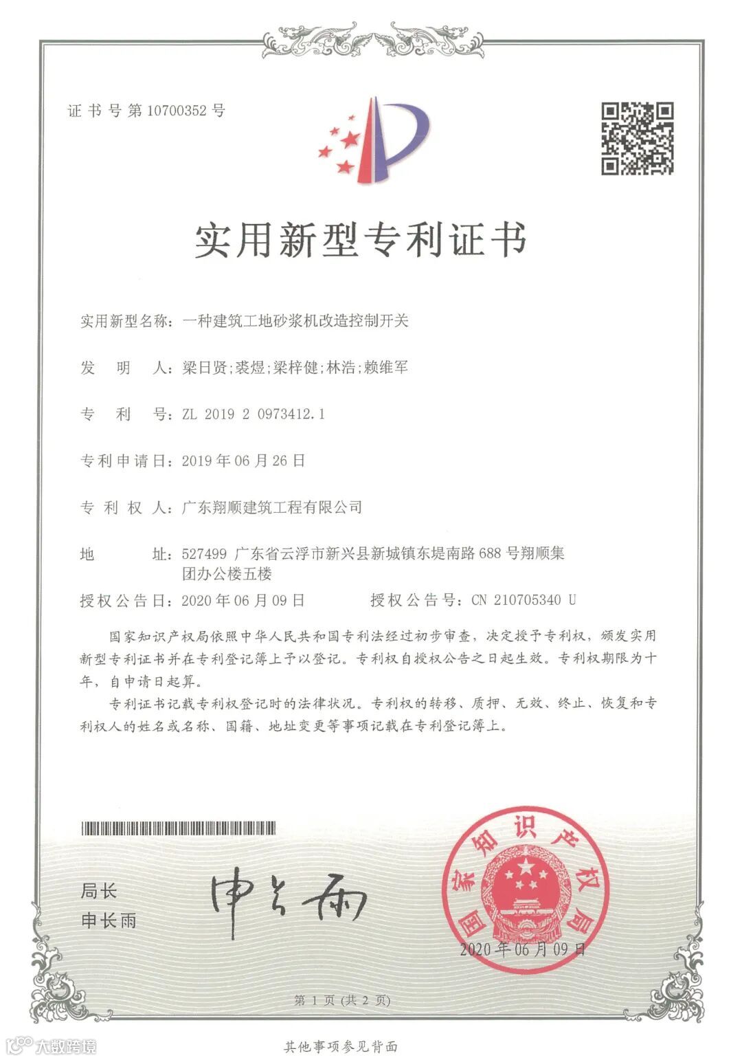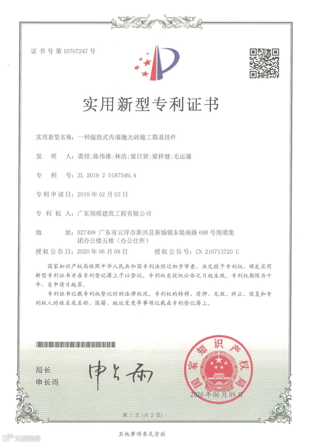 6月9日,获得一种湿挂式内墙抛光砖简易挂件和一种建筑工地砂浆机改造控制开关实用新型专利证书