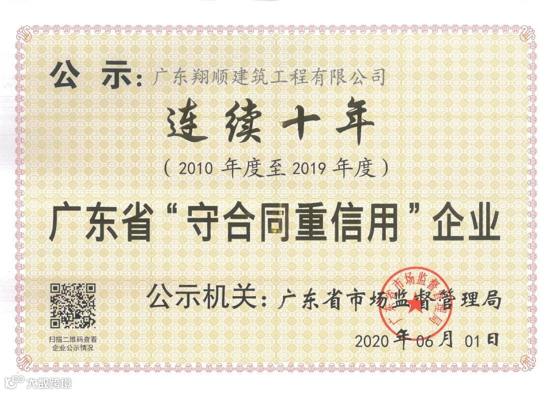 我司从2010-2019年连续十年荣获“广东省守合同重信用企业”荣誉称号!作为一家大型建筑企业,始终坚持把守合同、重信用放在企业经营发展的重要位置,且在诚信建设、合同管理、守信经营等方面不断完善,依托技术的创新,以及服务质量的提升,从而赢得广大客户以及社会各界的高度信赖。
