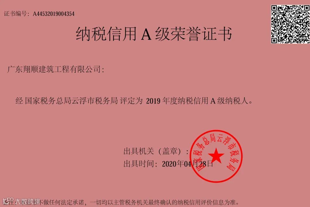 4月28日 经国家税务总局云浮市税务局评定为2019年度纳税信用A级纳税人