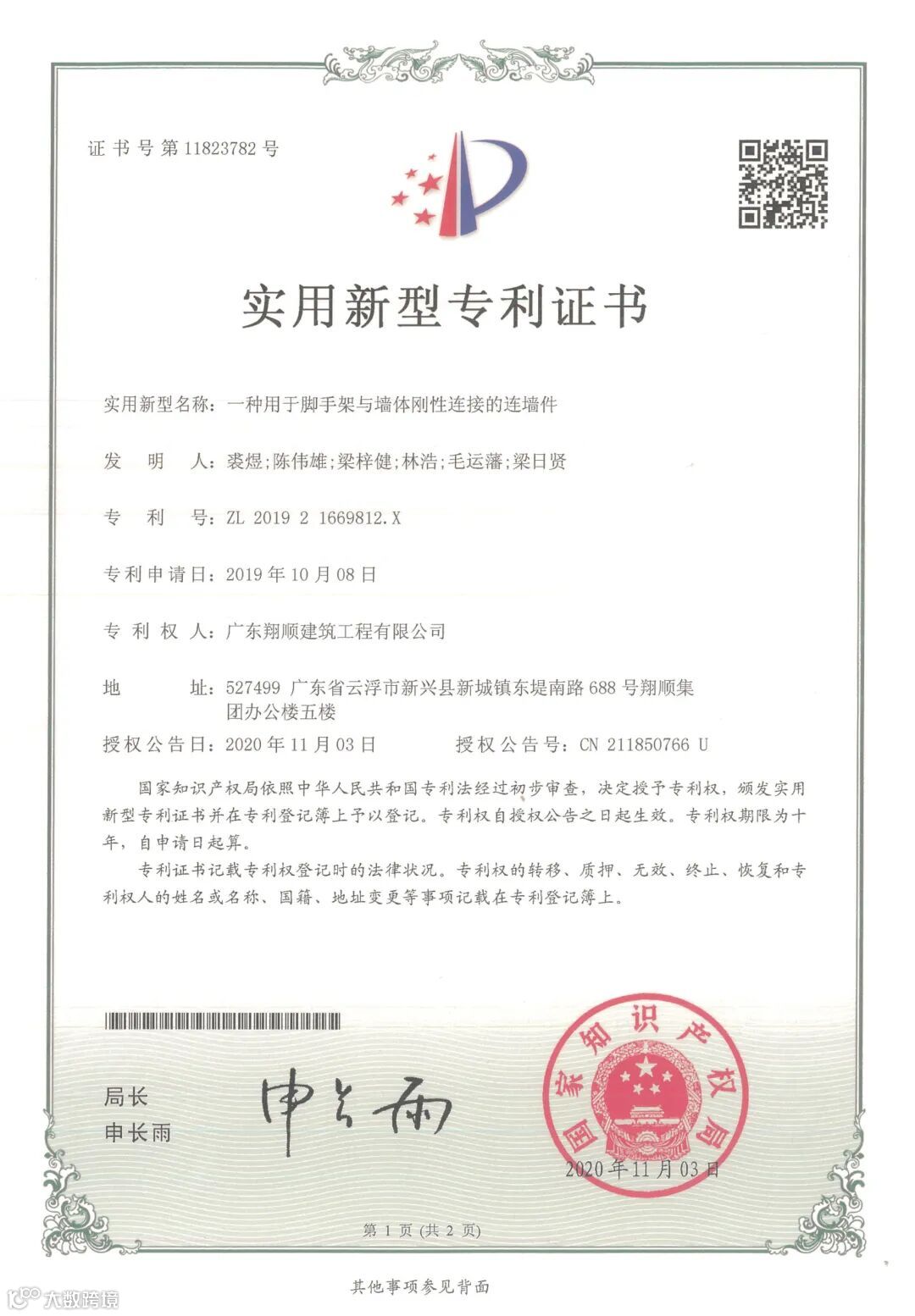 11月3日,再度获得一种用于脚手架与墙体刚性连接的连墙件实用新型专利证书。